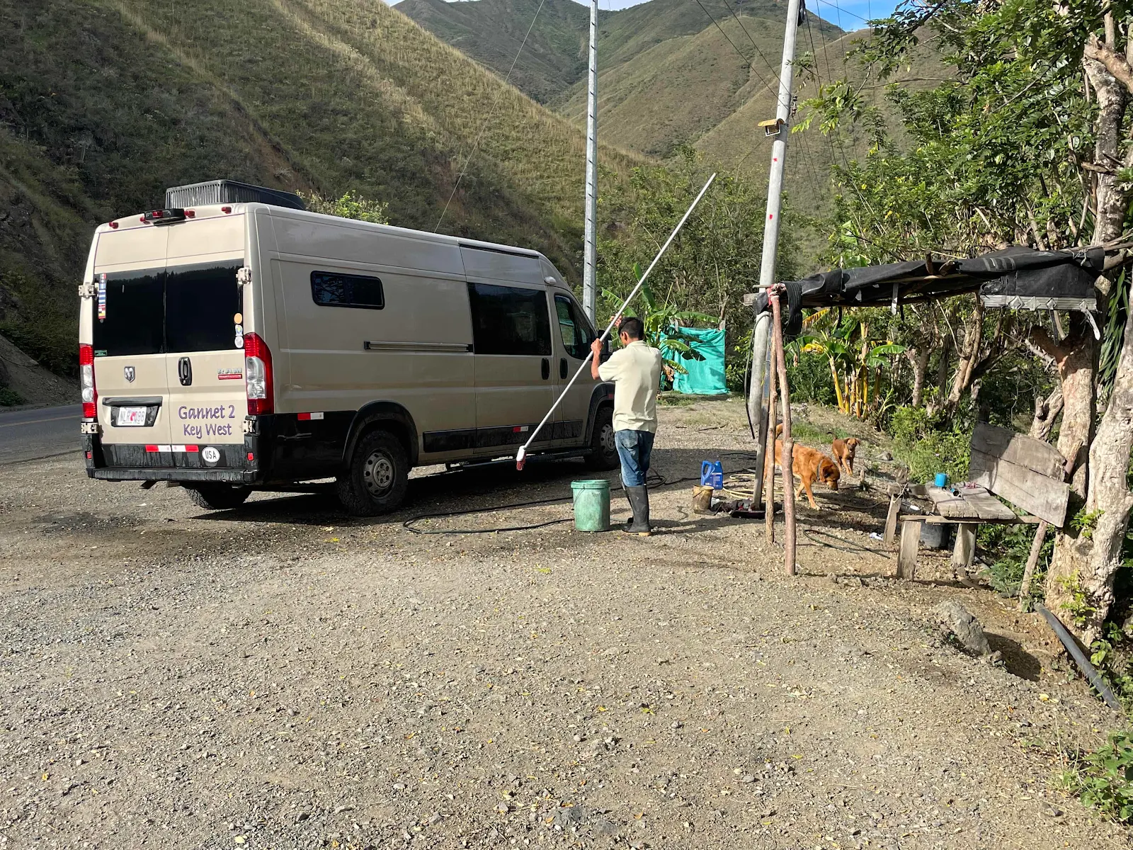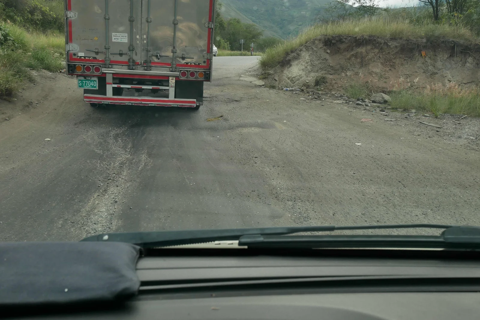 If the road had slid away into the void the authorities would have had to rebuild. Instead they have just ignored the mess. Imagine coming across this blind at 50 mph, and it’s worse than it looks. The truck stopped and proceeded very gingerly across the dirt.