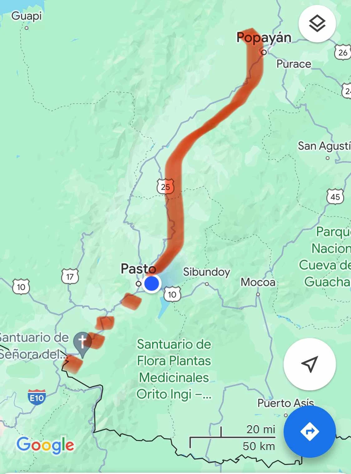 We spent the night at a camping spot just outside the city at 9,000 feet at 1 degree 12 minutes North of the equator. The dotted line below shows the rest of our route to the border with Ecuador. We plan to cross Tuesday morning.