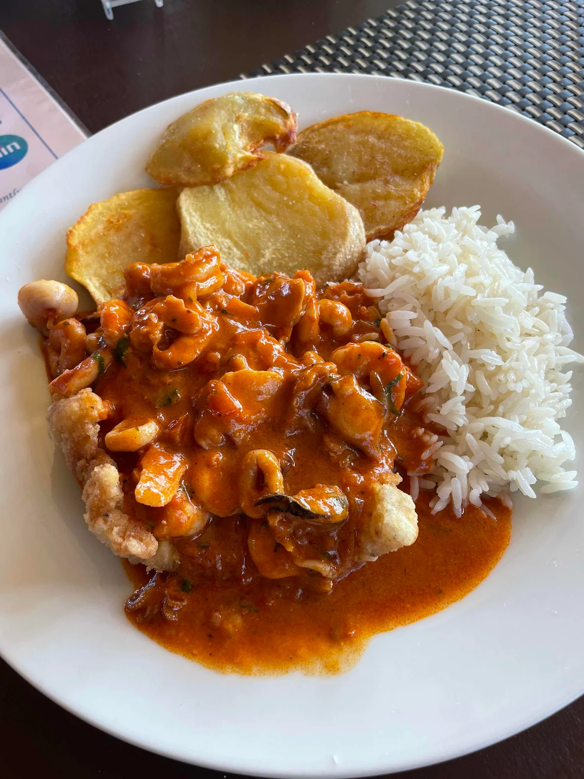We would like to travel with them down the coast a while to make sure they are okay as they don’t speak Spanish and being broken down alone by the side of the road is pretty desolate. However they want to stay another week here and neither of us can stand to stay that long. We’re hoping the test run goes off okay and we can leave ahead of them, perhaps tomorrow. There are ruins down the road on the way to Machu Picchu (“old peak” in Quechua) we want to visit. Fried fish fillet in a seafood sauce: