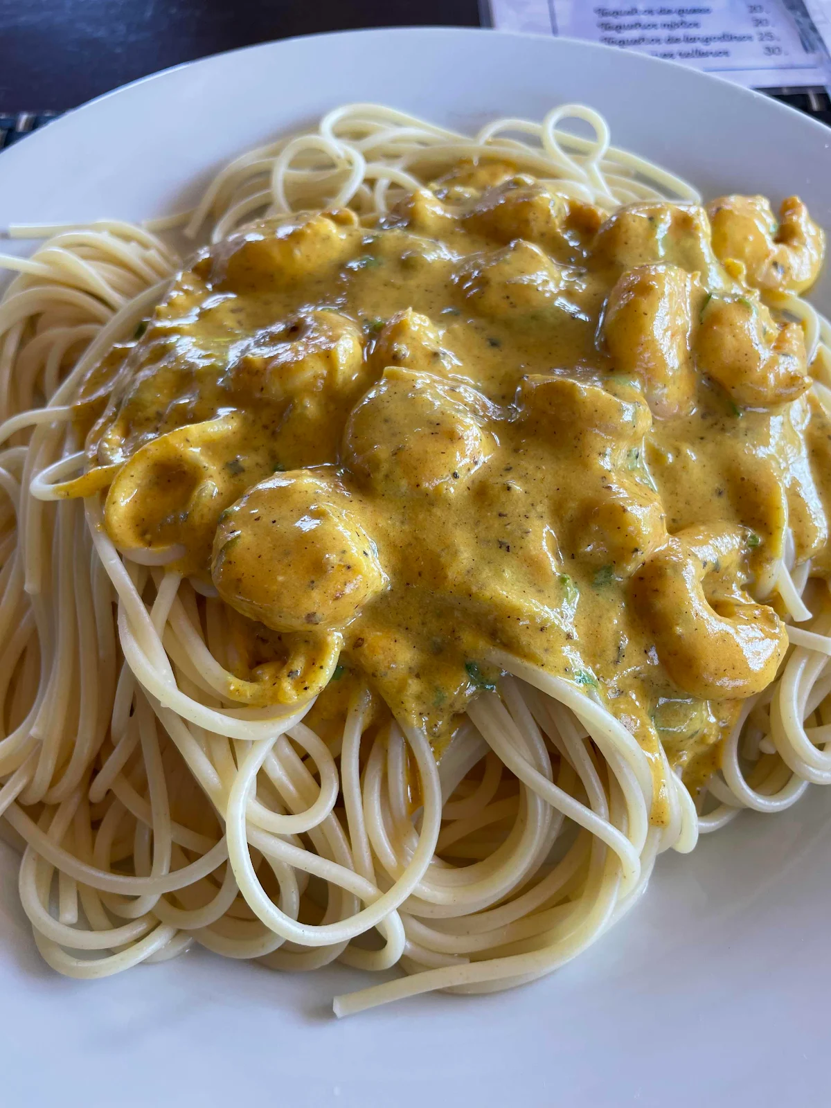 Florian also told us a disturbing story of being broken down roadside and an overlander driving by and not stopping. They met later and the other traveler shrugged and said they didn’t stop as there was nothing they could do. It is an ethos we do not agree with and perhaps we are out of touch with more modern younger travelers but we would never do that. Pasta in shrimp sauce: