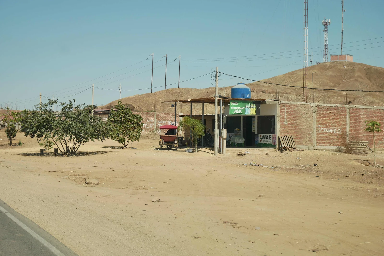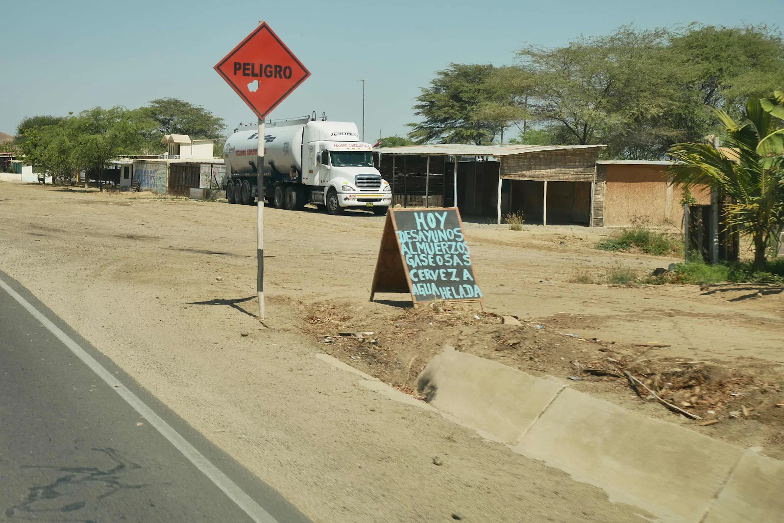 Breakfast, lunch and drinks (including beer) are for sale. The red sign advises some unspecified danger ahead. Just another day on the road in Peru then.