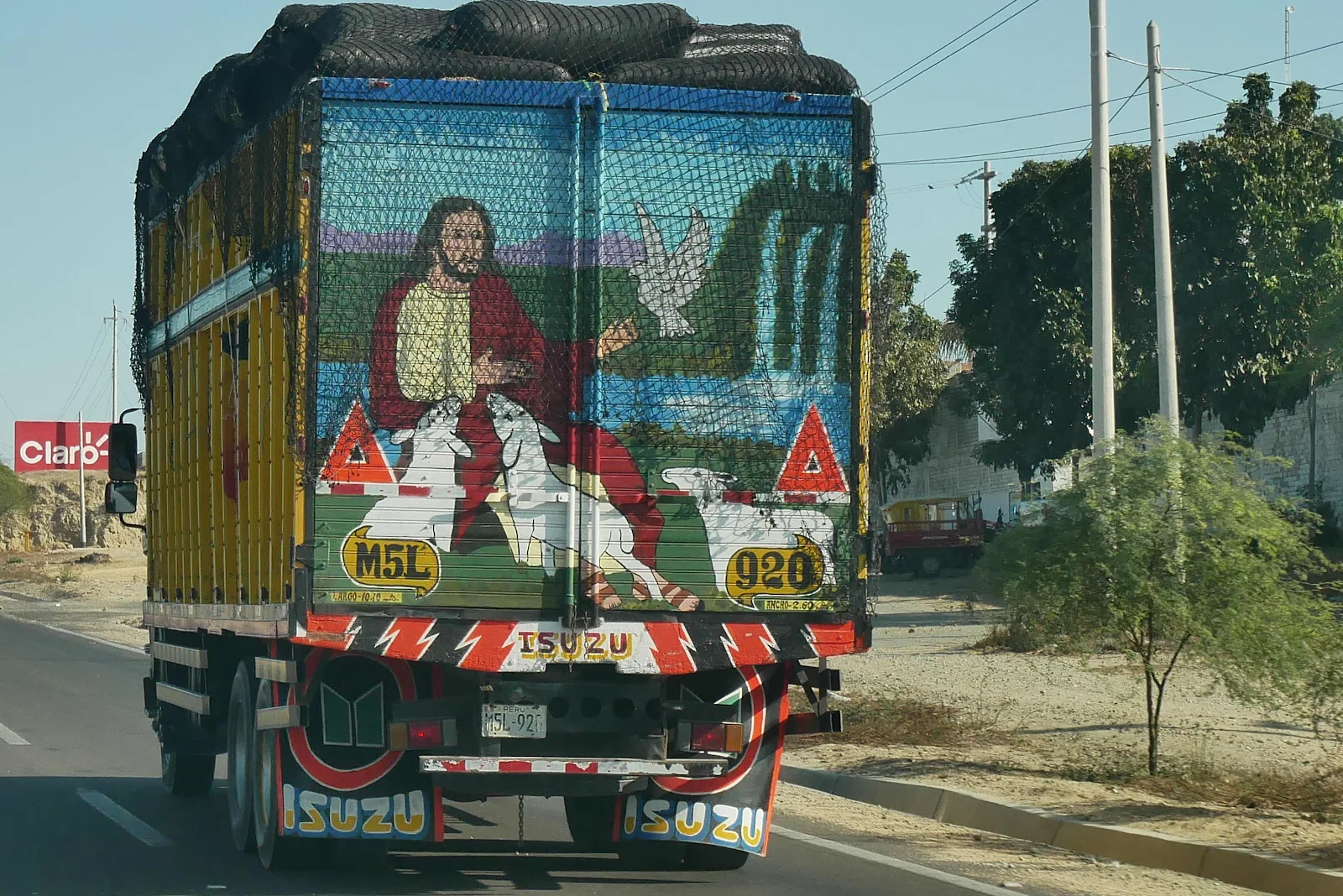 Other overlanders told us the coast road is relatively smooth and utterly boring. It didn’t start out smooth with plenty of sudden and unannounced potholes and rough patches. I noticed the murals they paint on the back of their trucks. Jesus is a popular subject with a medieval Italian renaissance look:
