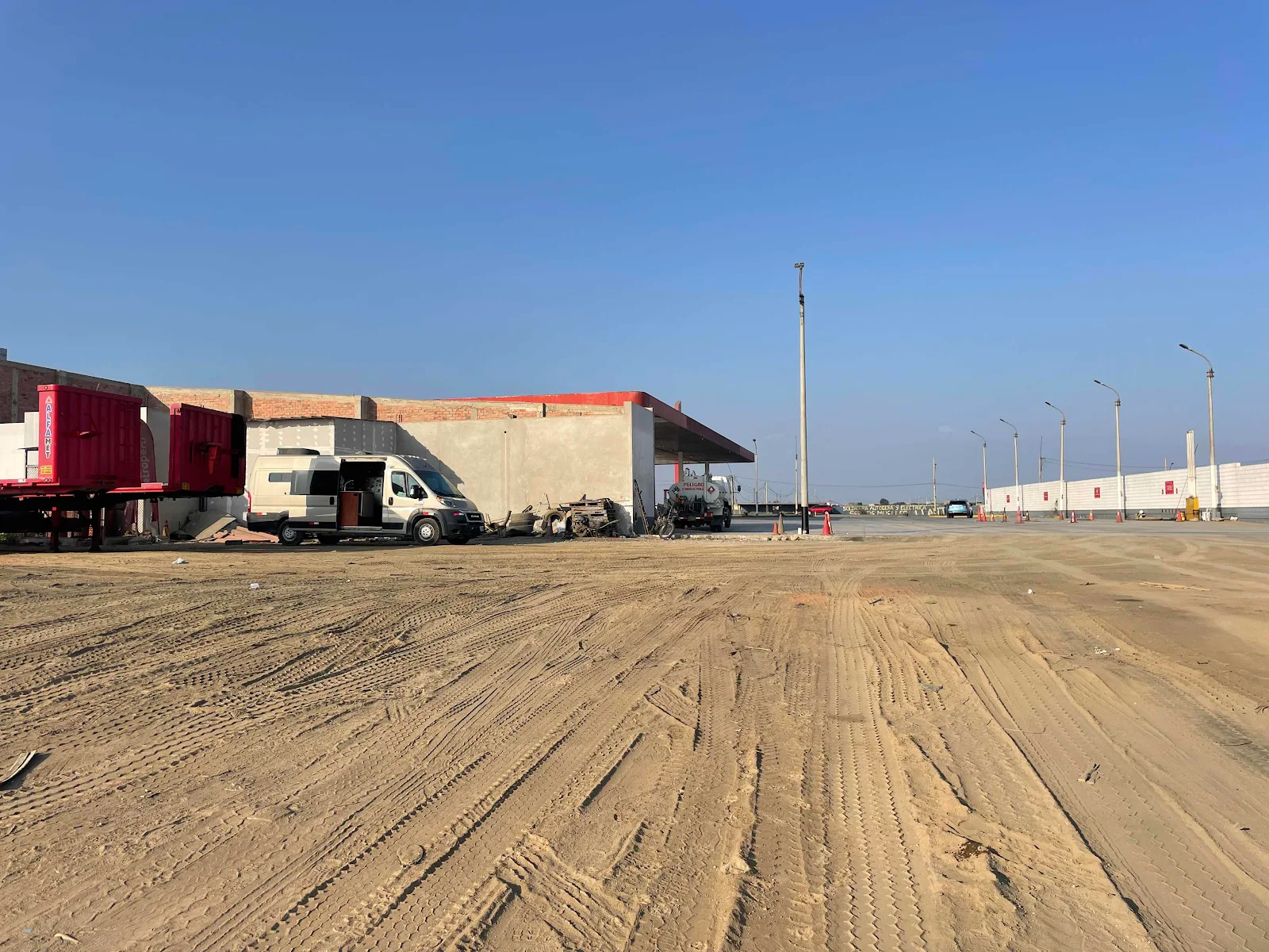 We found a nearby gas station and they said we could park in the rear in dirt as soft as talcum powder. It is free and it’s surprisingly quiet in our well insulated home.