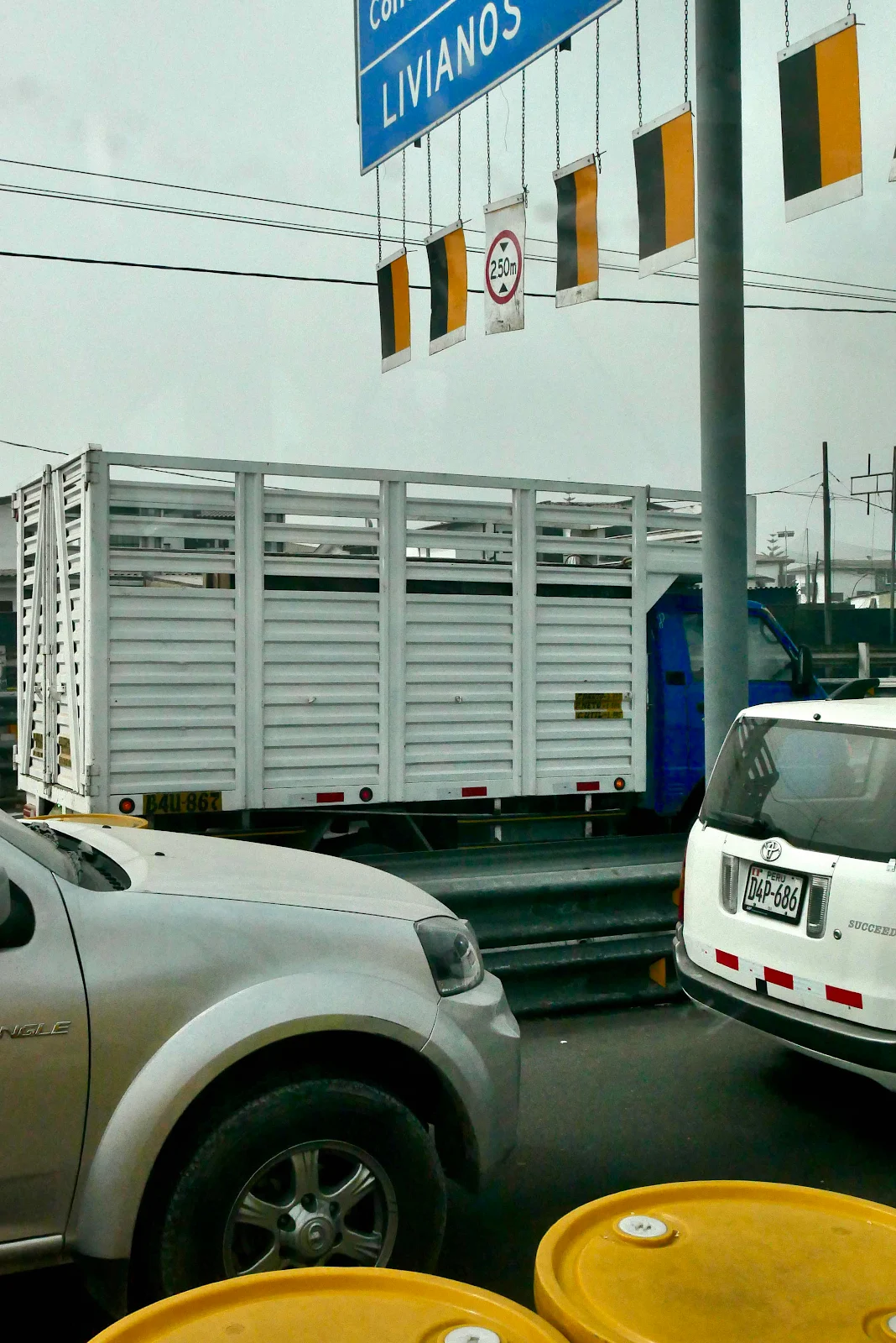There was a toll booth too which slowed us down. The charge was $1:75 which seemed not enough for all the hassle of waiting in line to pay. Plus they took credit cards… we used cash for 6:60 soles. And check out the height marker. 2.3 meters is seven and a half feet. Check out the truck passing underneath. Something isn’t right there…