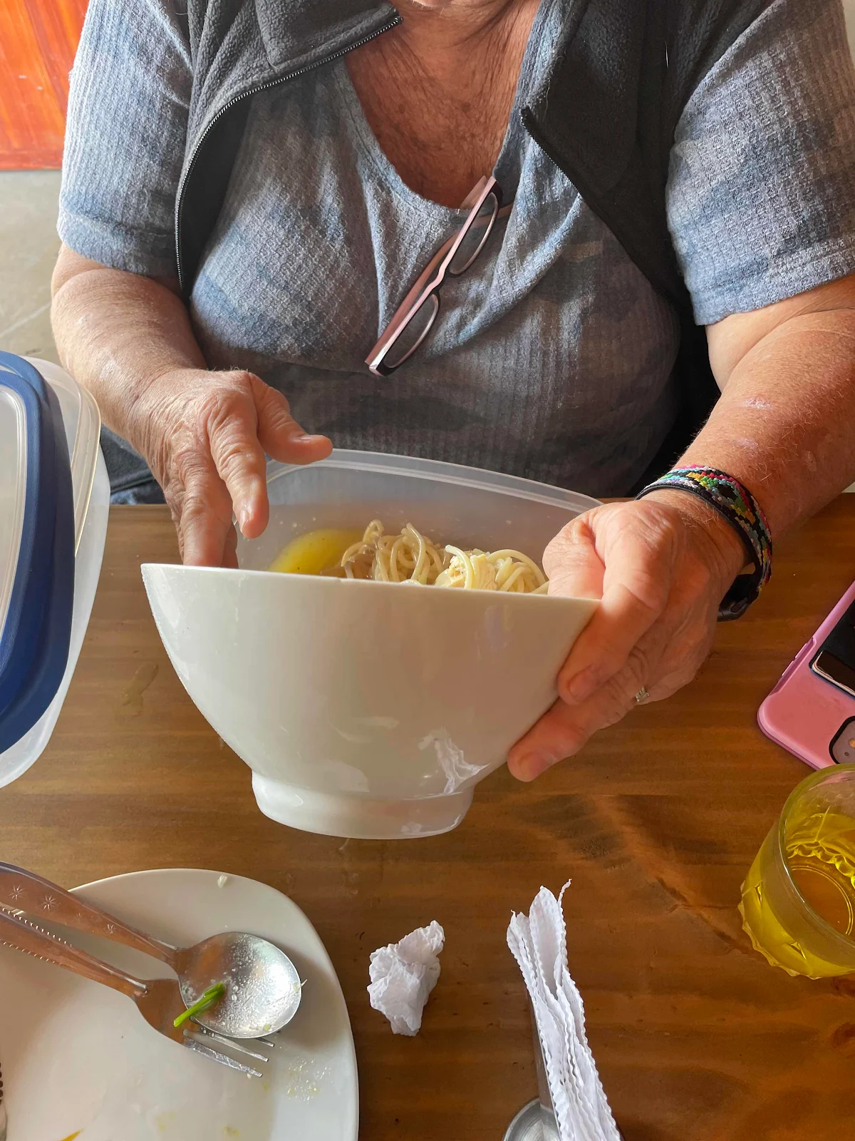 Layne brought a to go box which fascinated our waitress. That and the fact we travel with a fridge. We had soup for dinner Sunday night, and this was the base.
