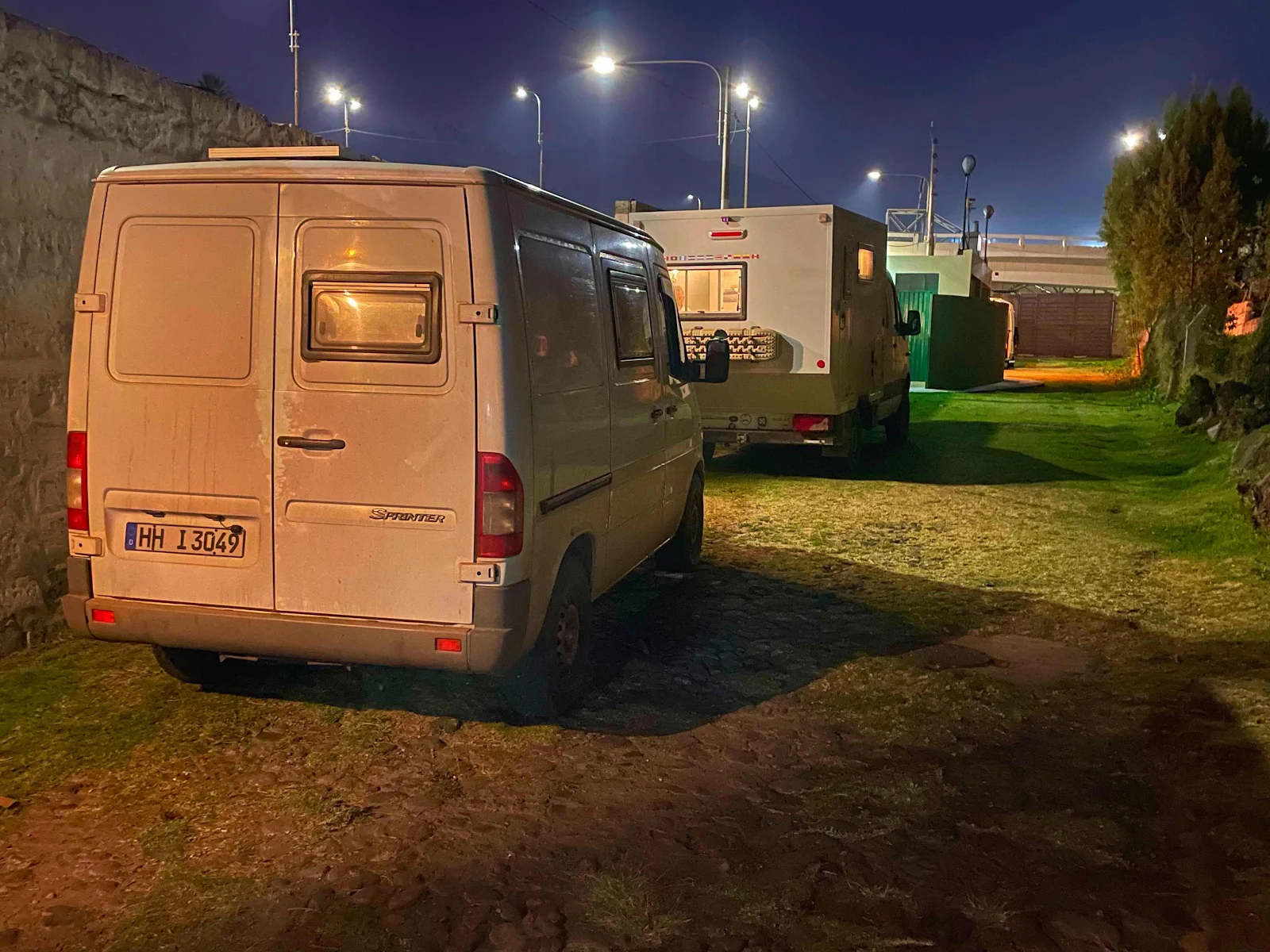 A German Spribter with worn out brake pads and no spares. A larger Dutch newer RV in front of them. We met the couple in Quito but they do not communicate so there are no stories. The Germans are a bit stressed but we may find out more later when they are sorted out.