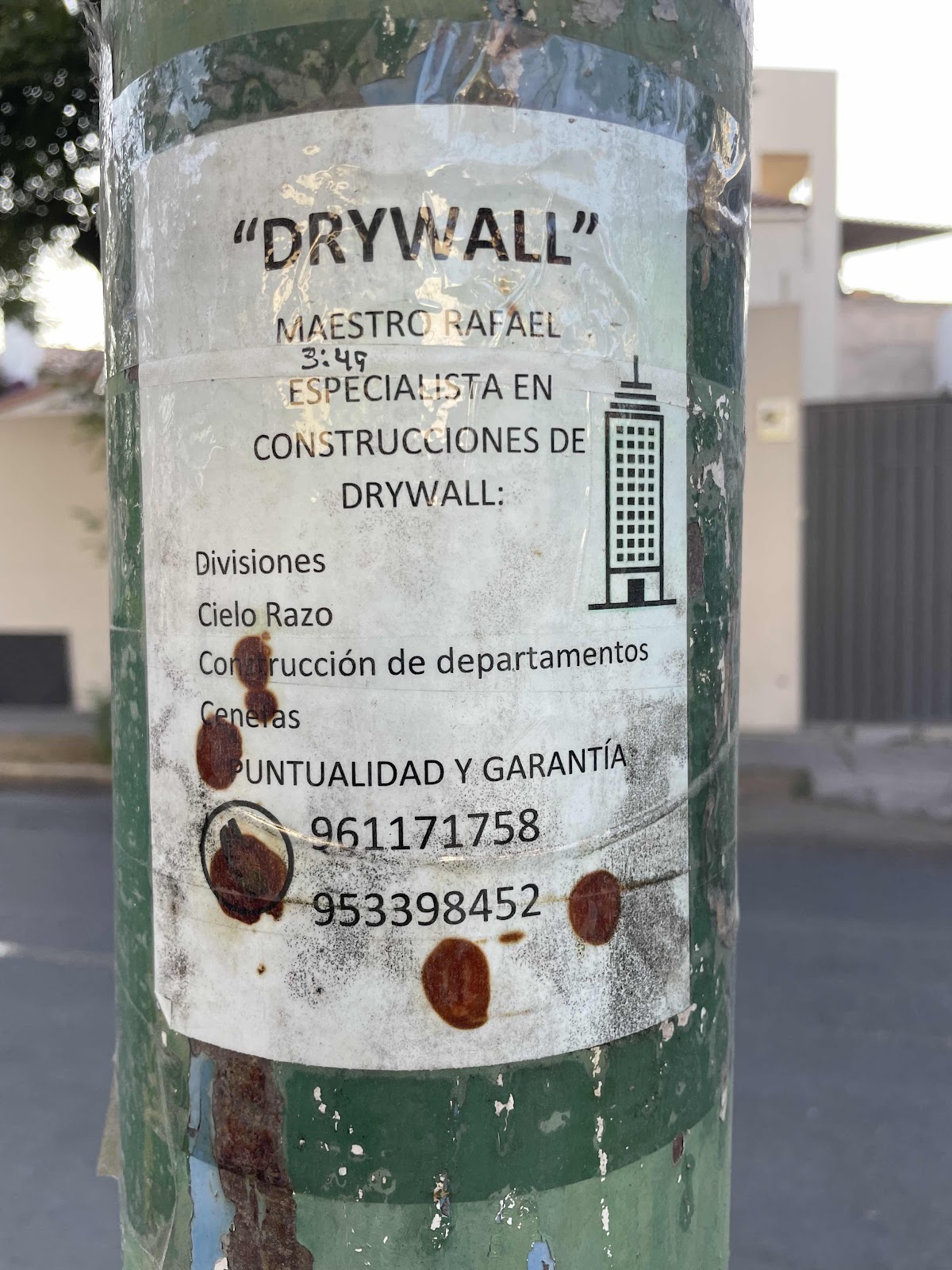 Drywall is I guess a word with no D equivalent. You’ll see lots of electricians and plumbers and various artisans including healers and snake oil sales advertised on lamp posts around town.