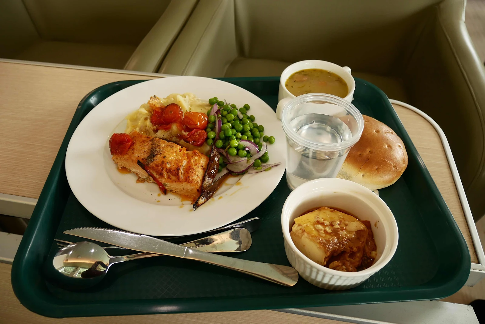 The crew has been very attentive and they along with most passengers have made a fuss of himself which he enjoys. The food is solid and unpretentious but filling. Apparently they offer vegetarian vegan and gluten free options for dainty travelers though this journey is less cruise ship and more cargo carrier. Salmon mashed potatoes and peas: