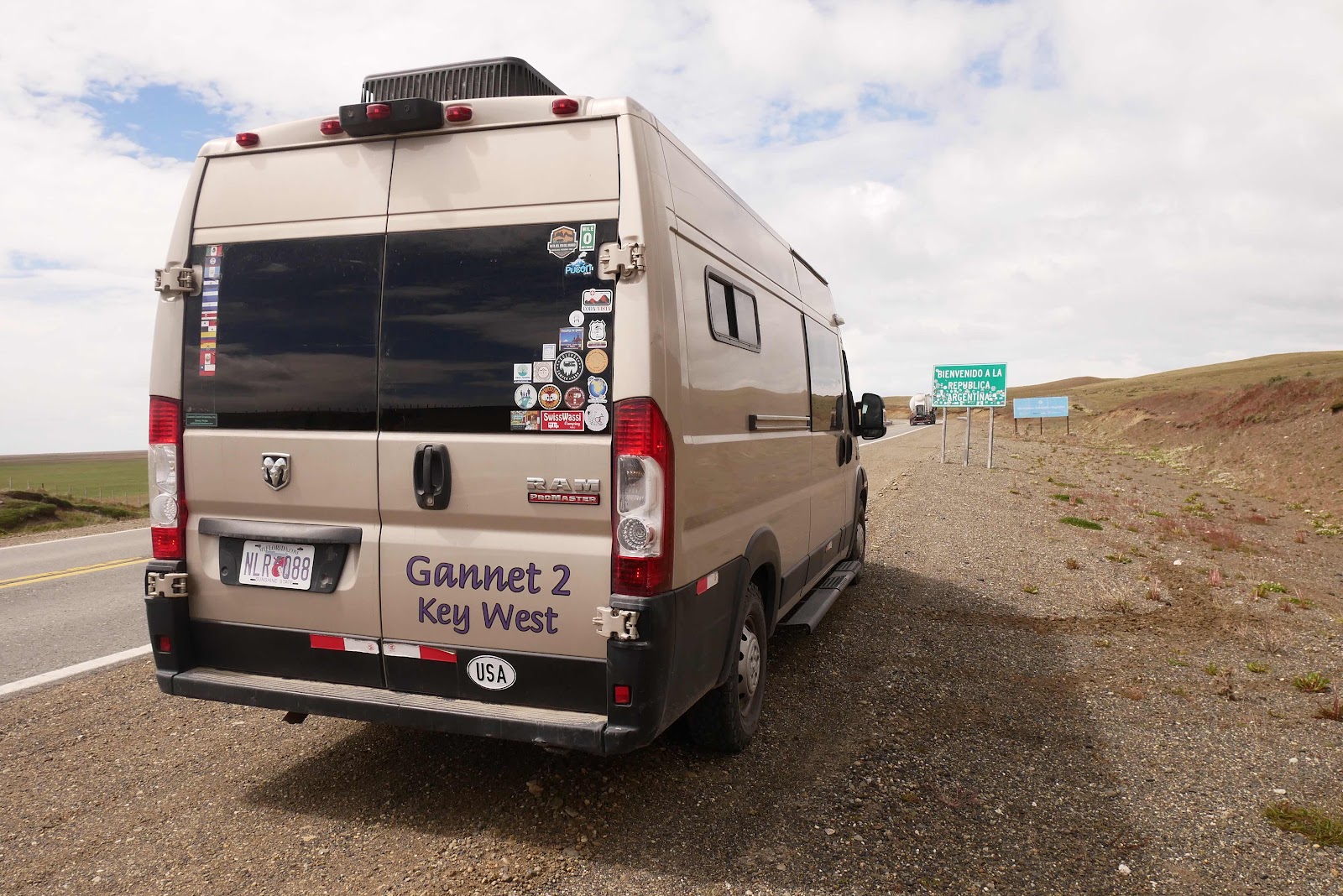 At last the border. And this one was over in minutes. We parked, walked in struggling against the wind and we got it all done, including a stamp on Rusty’s Chilean permit in five minutes. No indicted our fridge or tour vegetables or anything.