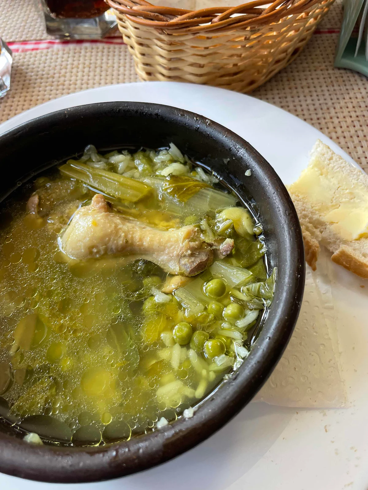 First course was chicken soup with rice and piles of vegetables, carrots squash and beans. It was delicious.