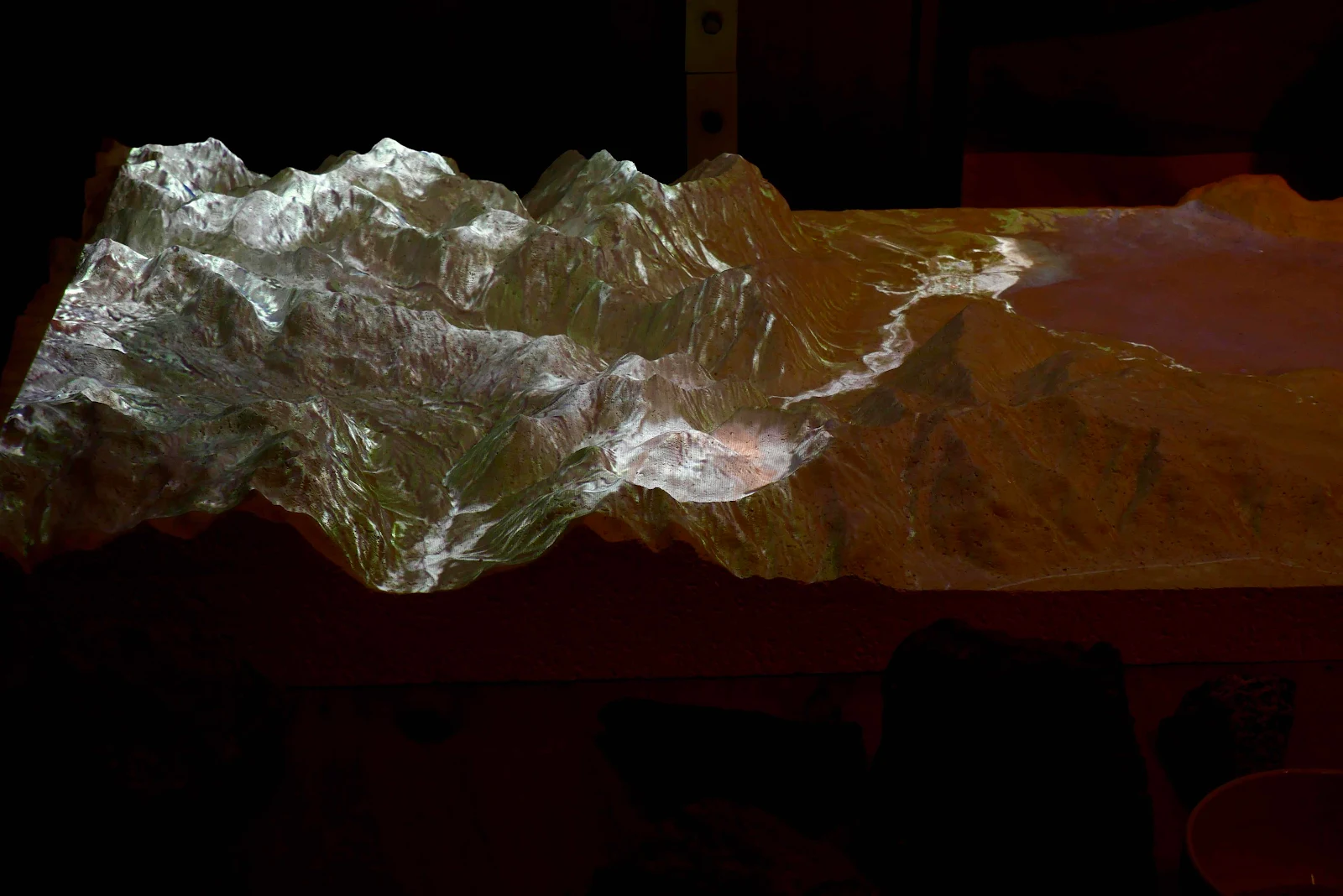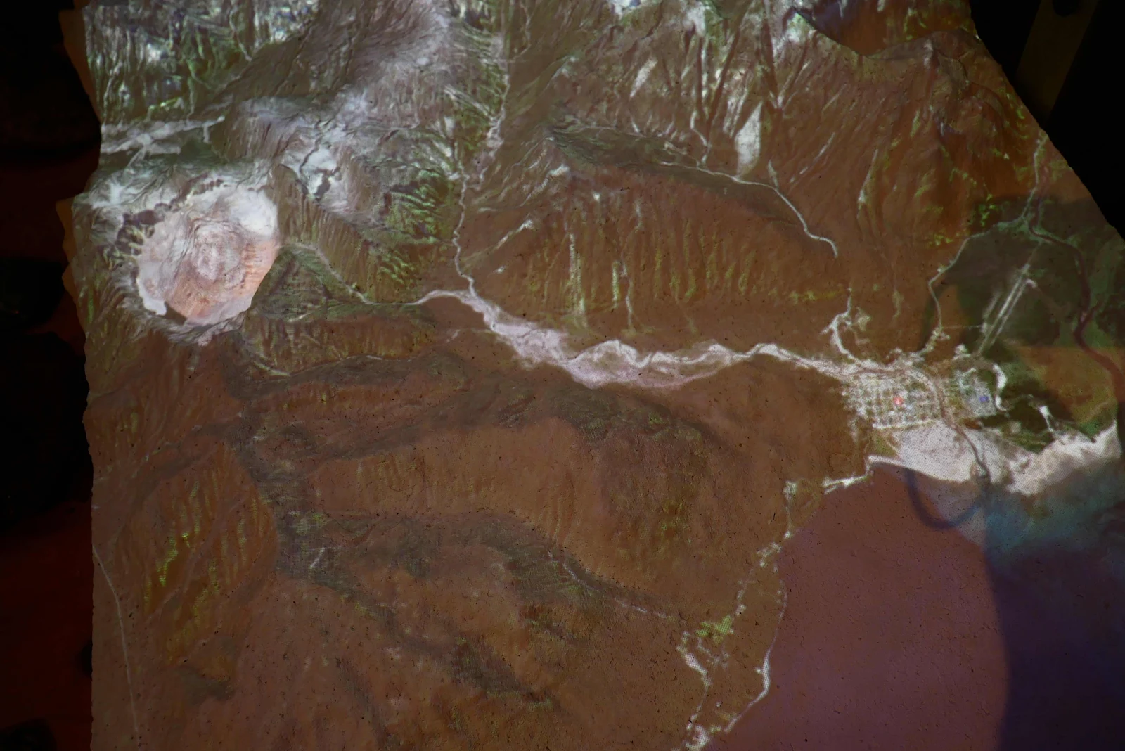In the photo above of a model on display in the museum you can see the Chaitén volcano crater, the white circle and the town far below off to the right at the end of the white valley. Below you can see the column of ash from a video we watched.