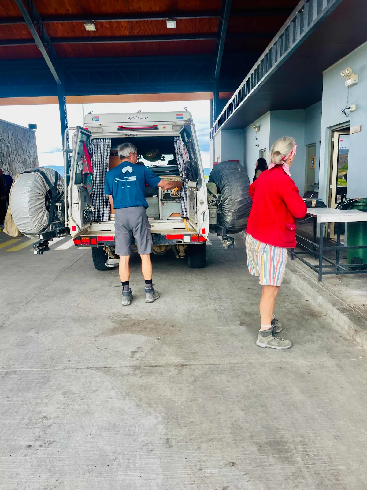 We chat and joke our way through and we saw the payoff outside. This Dutch couple radiated irritation with us and the officials and the process. They ended up snorting their Gouota for inspection. Layne handed over our fruits and vegetables, showed them our fridge and our dog food ( why? No idea) and we left all smiles and waves.