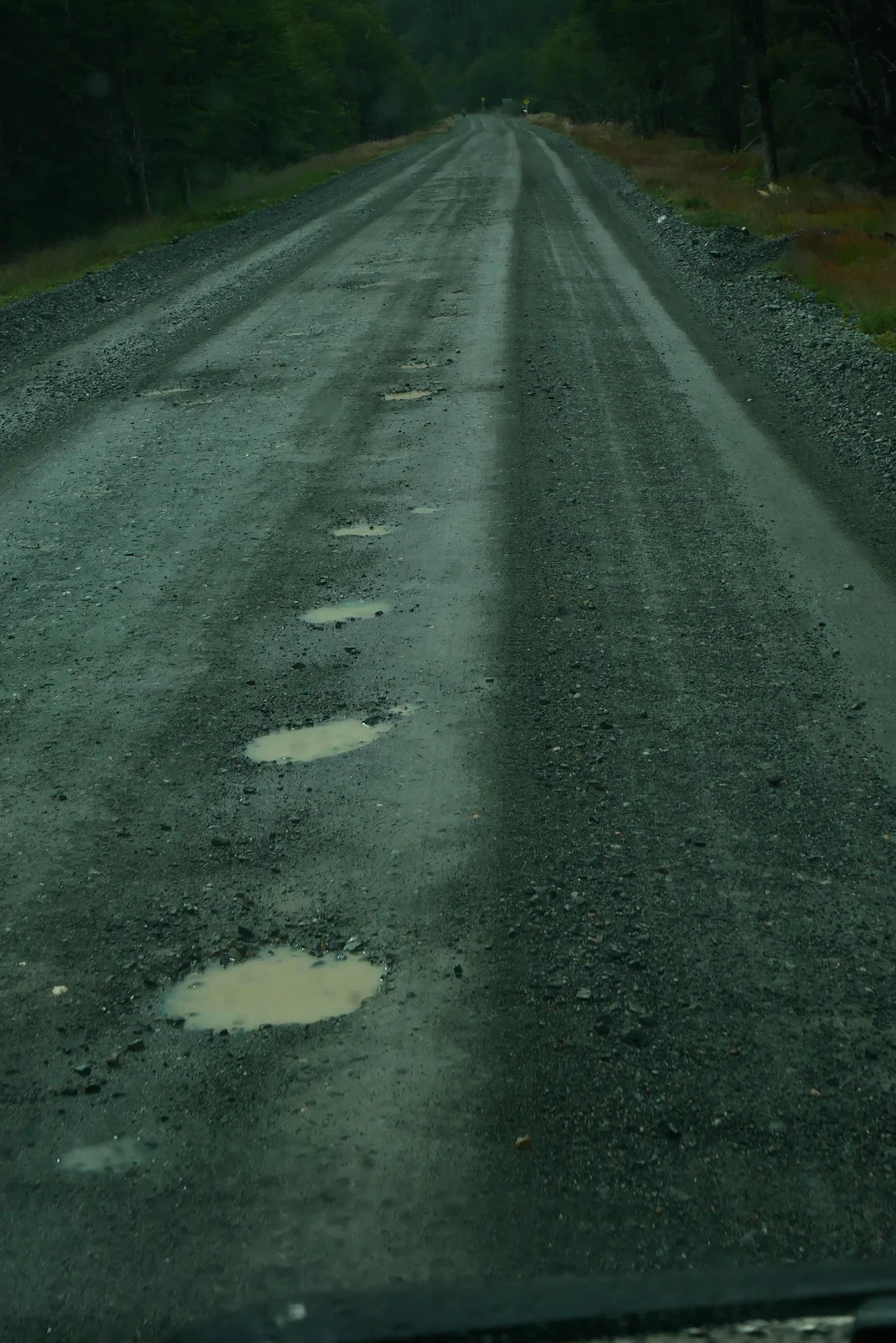 The Carretera Austral, Ruta 7 driving toward Villa Cerro Castillo a small town fifty miles to the north. You can see specks in these photos because it was raining hard enough the wipers couldn’t keep the windshield completely clear. The temperature was 48 degrees so our powerful cabin heater was extra nice when we looked out at touring motorcycles and bicycles.