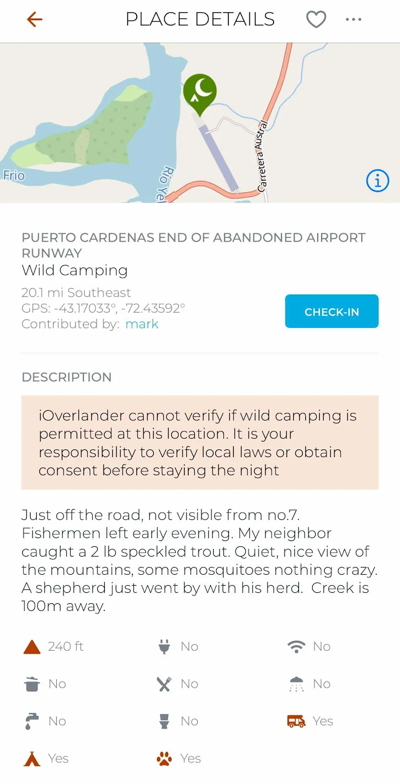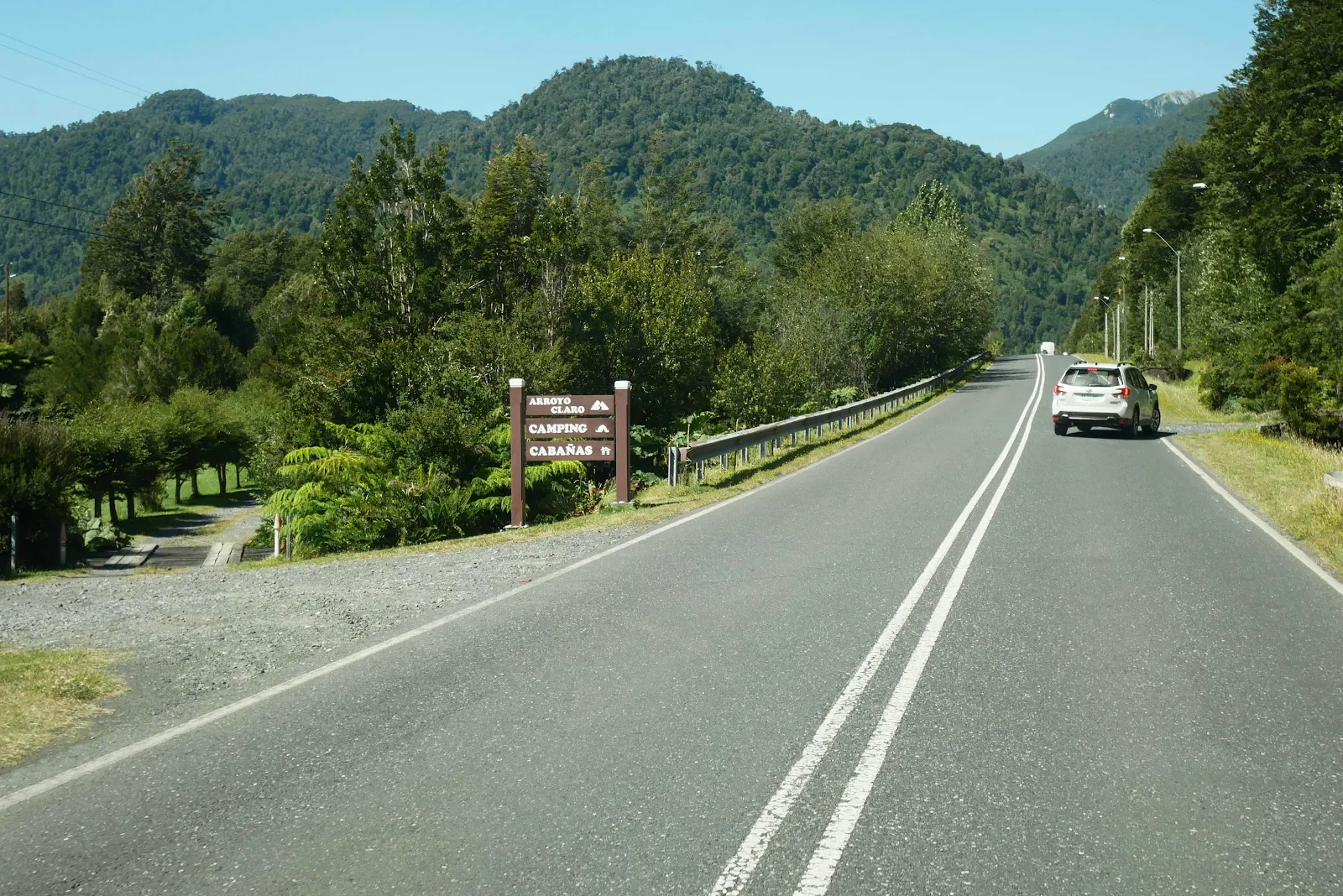 Three and a half miles from Chaitén we saw another sign. We had planned at this point, five o’clock, to just go into the port and look up a campground in the town itself. We pulled off not sure what to expect.