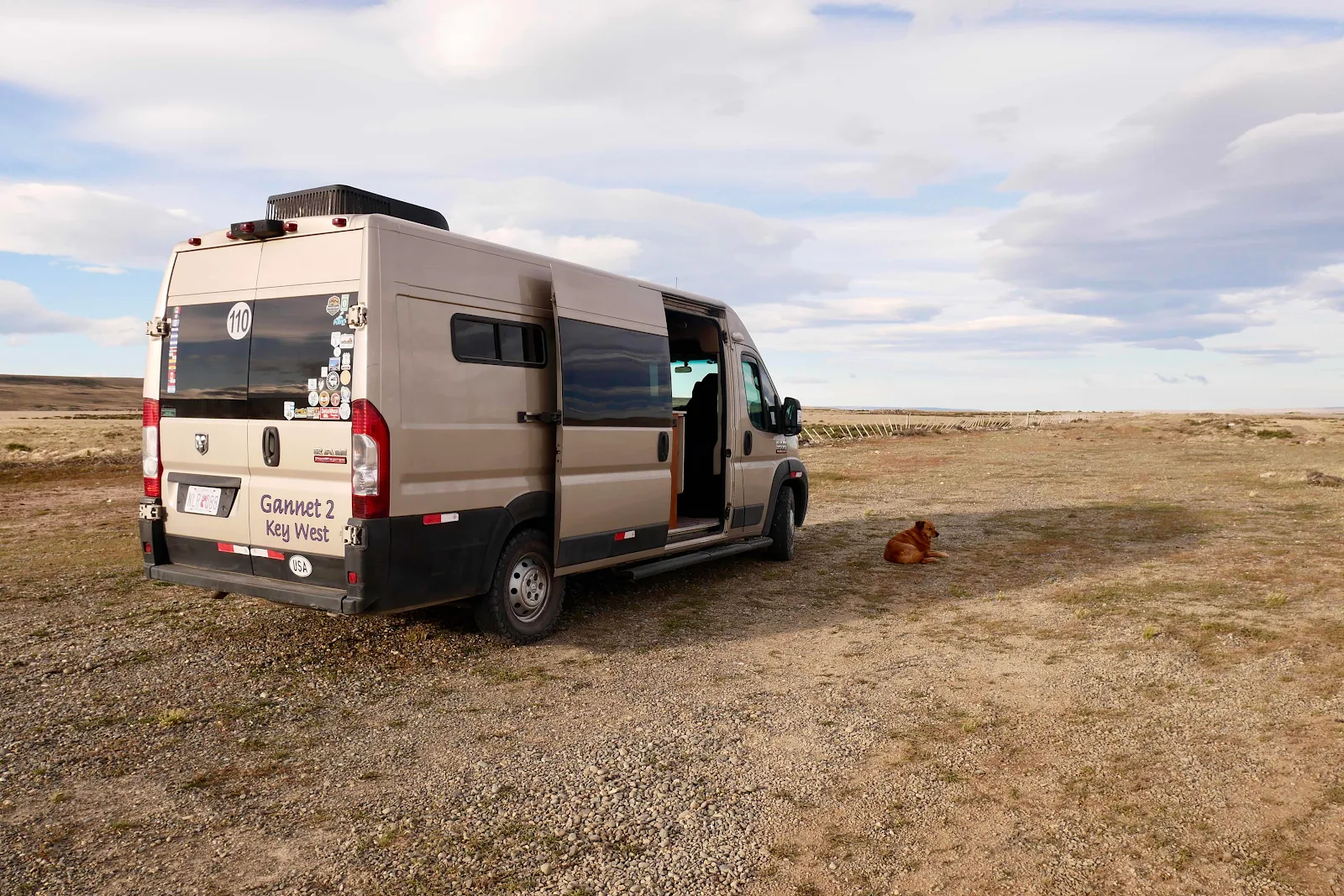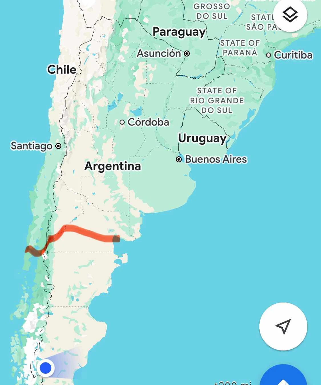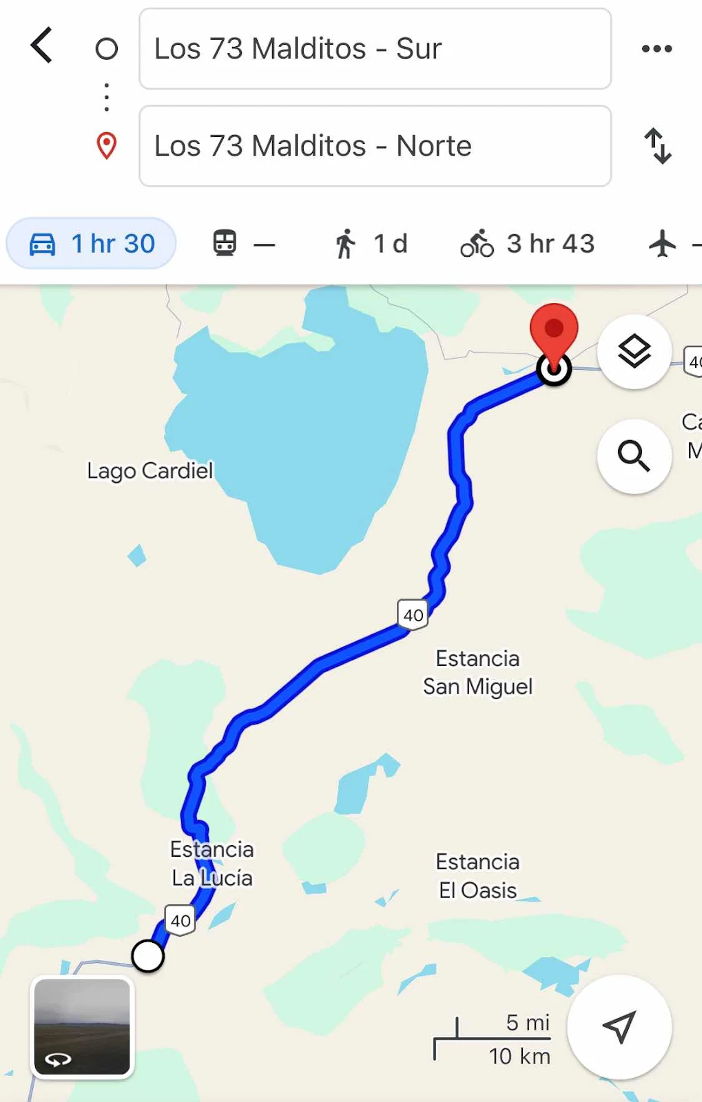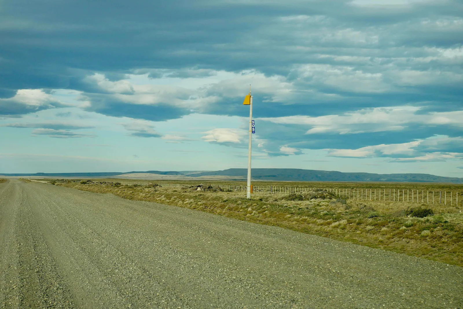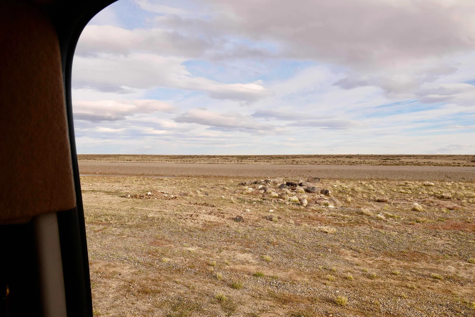 We’re still a long way south and that’s why it’s so windy here. We’ve seen 60 mile an hour gusts but it’s famous around here for winds strong enough to knock you to the ground or to rip the door off your car. We know of one overlander blown out of his truck who fell to the ground and broke a bone. Caution is the watchword when the wind howls. This far south winds blow around the southern oceans with no land masses to stop them so they sweep Patagonia uninterrupted. Every iOverlander camp site mentions wind protection ton or lack thereof. We park for the night bearing wind direction in mind. Rooftop tents on top of cars and tents on the ground get blown around routinely. We were looking for this gravel pit to get out of the wind but we couldn’t find it. We figured the grading of the road had covered the exit to this spot but relief from the wind looked nice on paper.