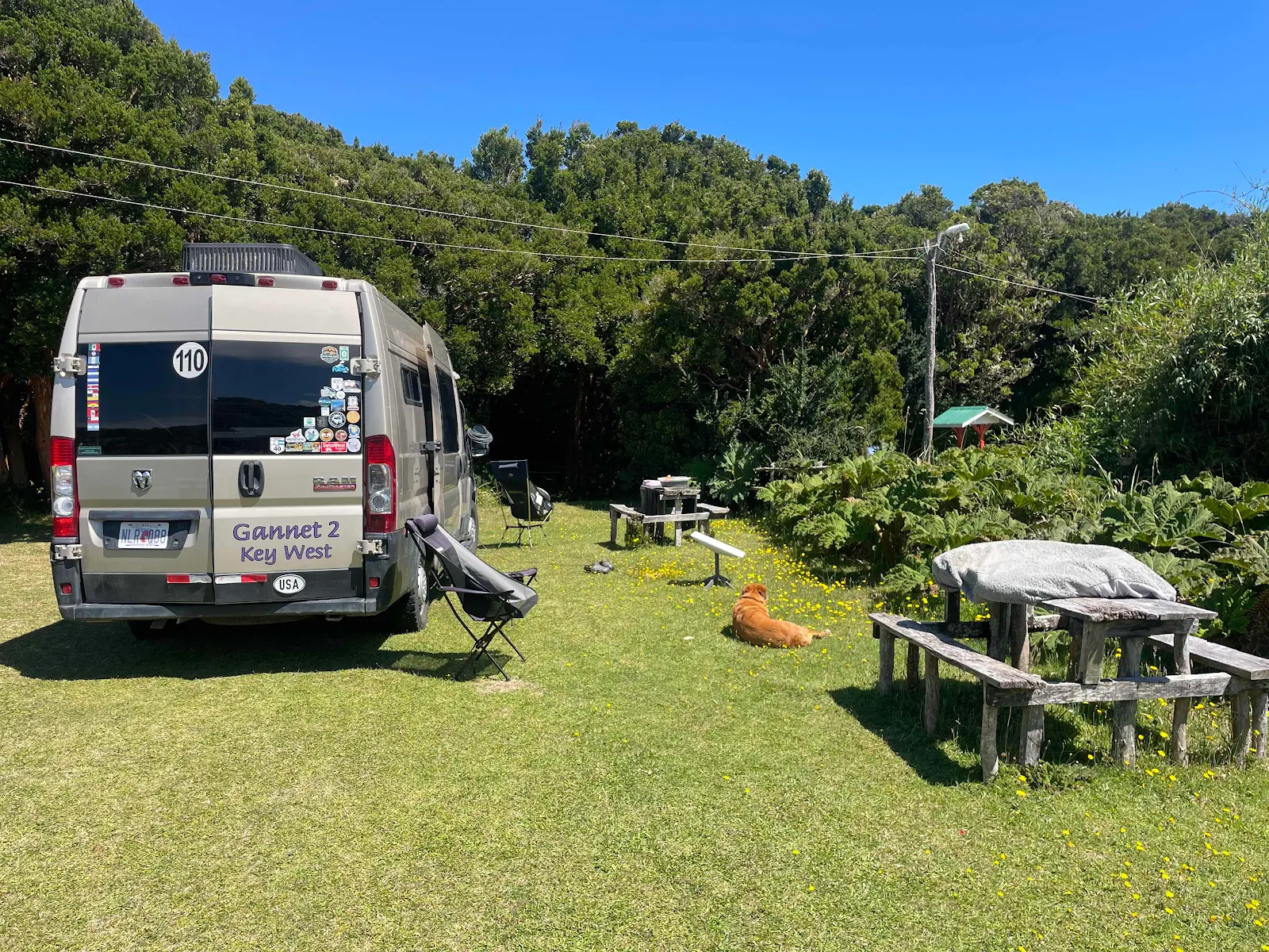 The campground was gloomy on Monday, cold and wet with heavy rain pounding GANNET2 so much so Rusty spent most of the day on his bed snoring and peering out of the back windows from time to time.