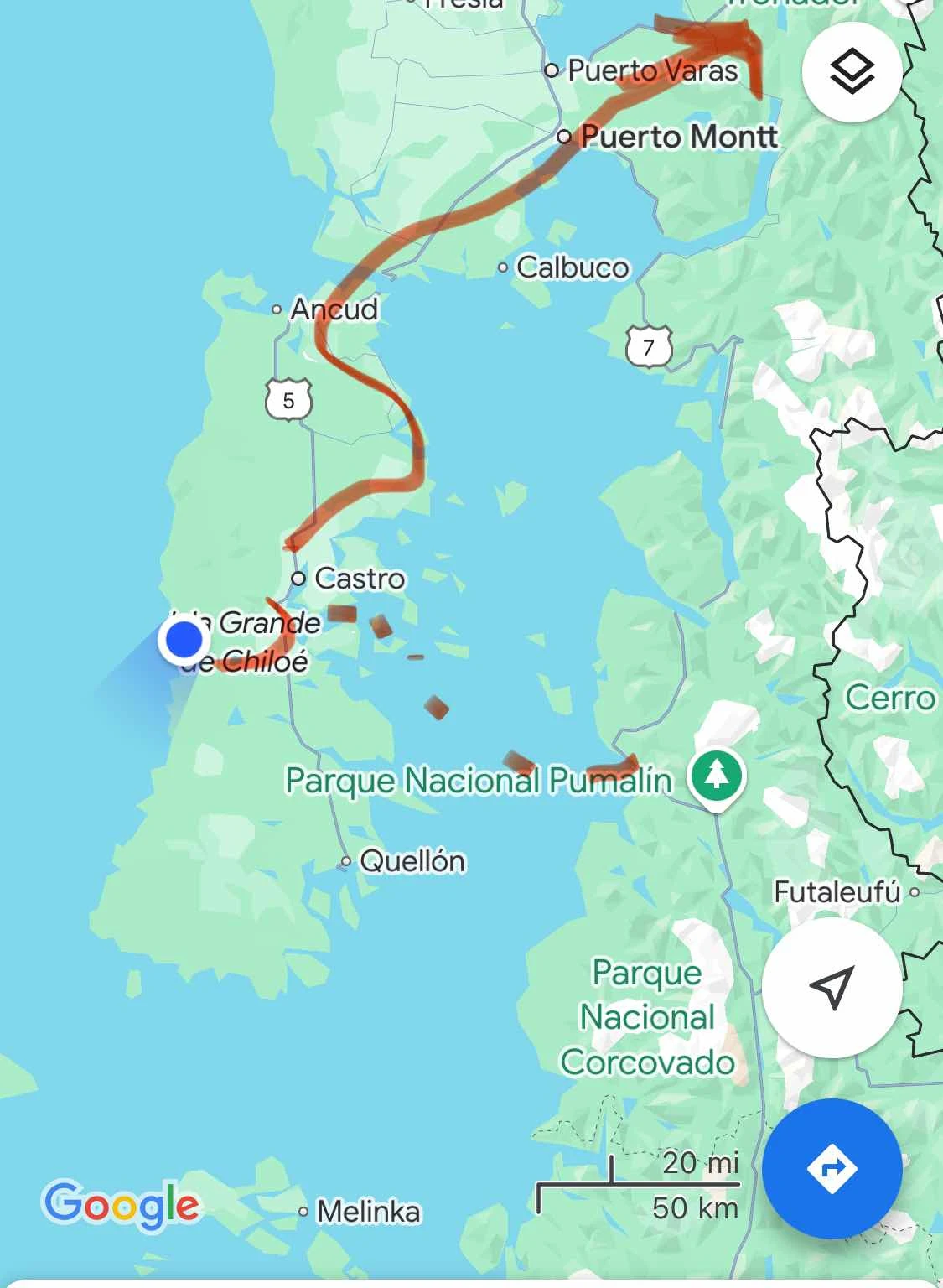 This is our route rather poorly traced by my finger. From Chaitén to Castro by six hour ferry ride on Sunday. Then on Monday we drive an hour across the island to Cucao and as you read this we will be planning a cross island drive to spend tonight, Wednesday in Ancud at the top of the island. Tomorrow we take the ferry to the mainland and drive an hour back to Puerto Montt.