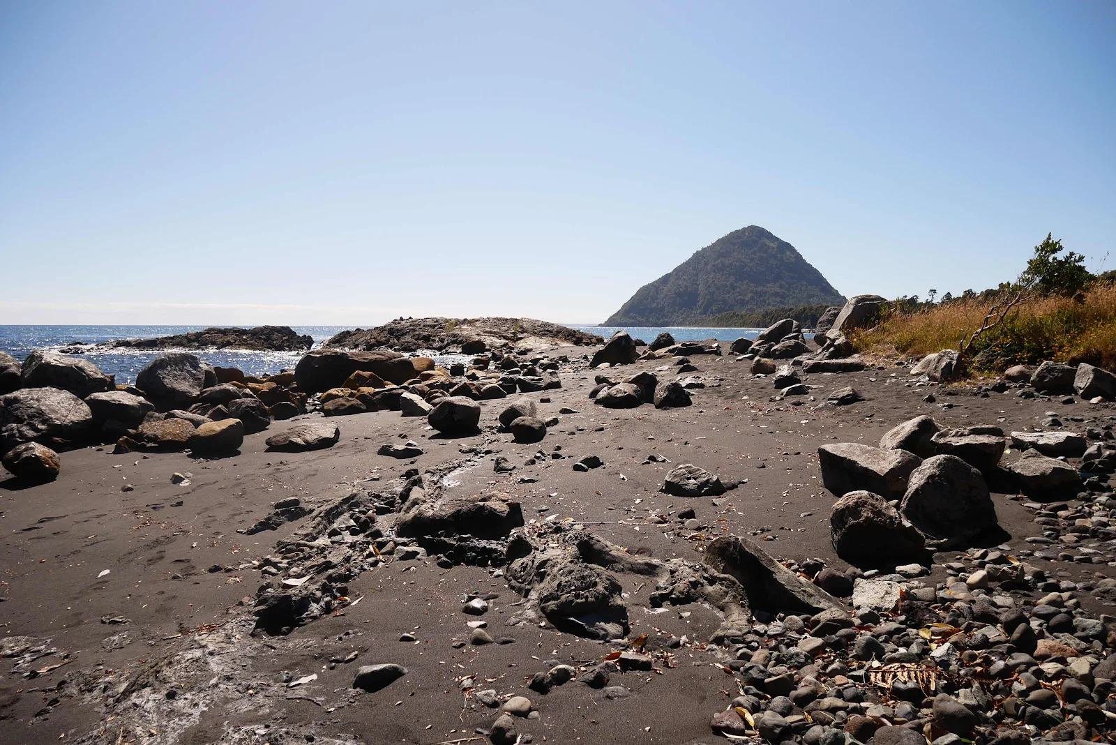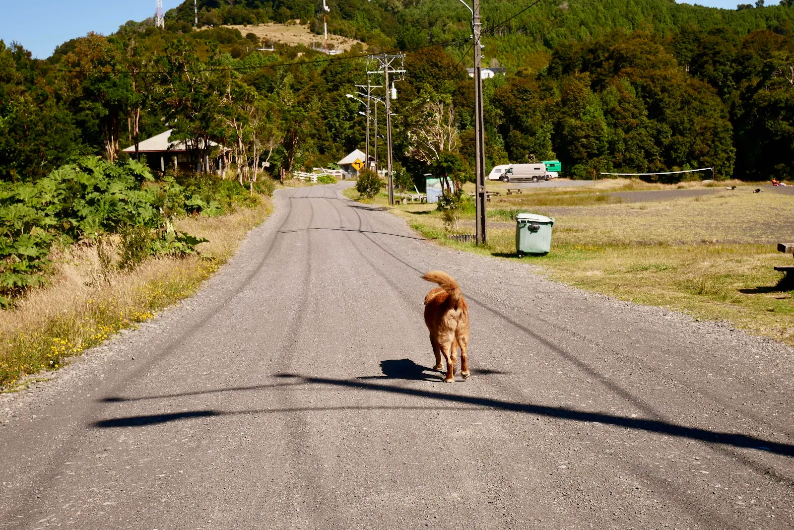 A park ranger walked in and told us overnight camping wasn’t allowed in this spot, firm but polite and apologetic telling me we could use the volcano campground five kilometers (3miles) up the road. Apparently he didn’t spot Rusty heavily camouflaged sleeping among the giant green leaves next to GANNET2 because park campgrounds are closed to pets.