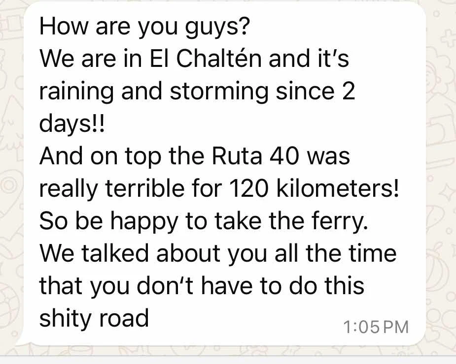 We took the four day ferry south to Tierra Del Fuego while they, running out of time, turned to Argentina and sent us a message I never quite forgot. They were not fond of Ruta 40 down here.