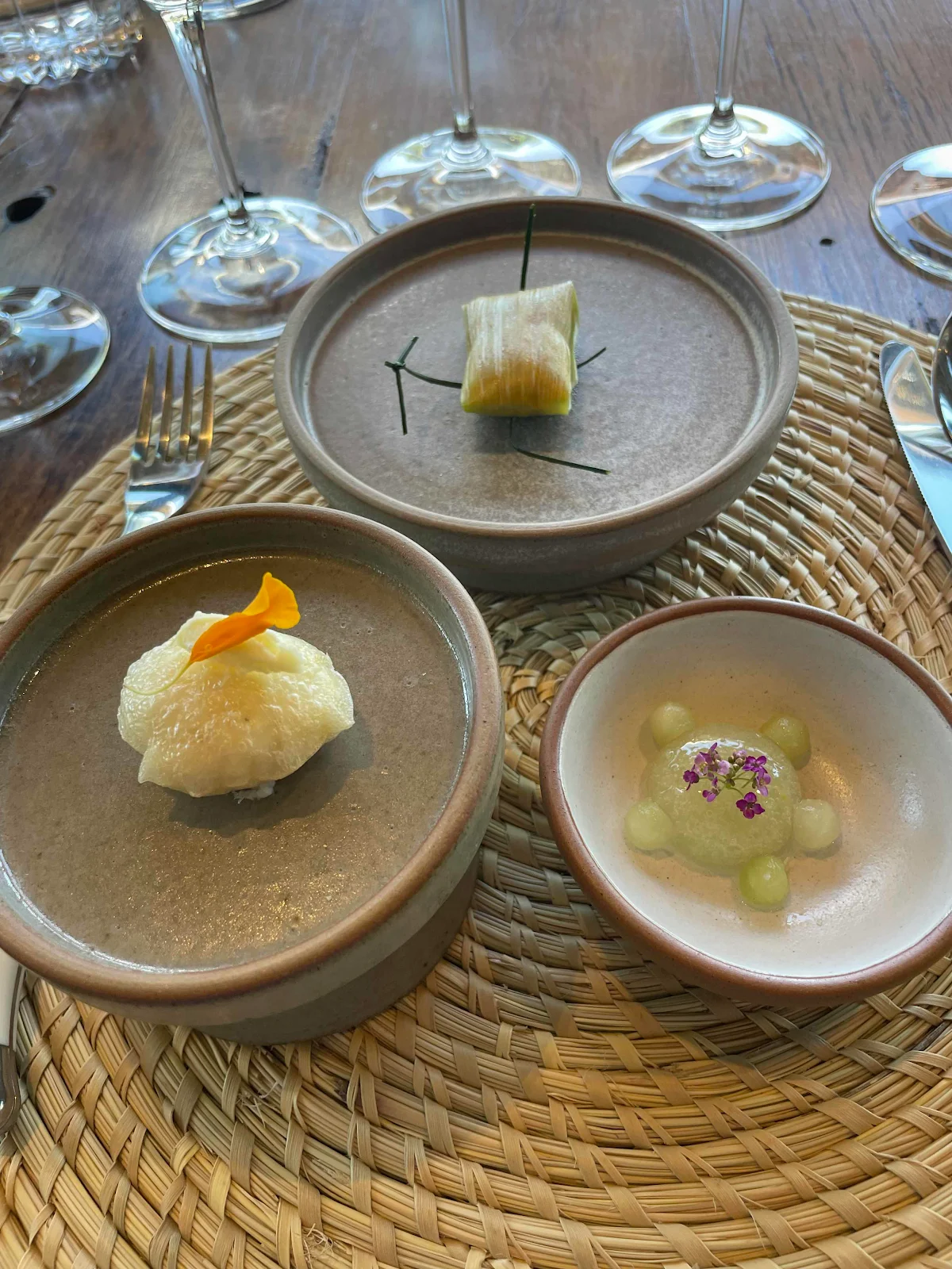 Let’s see if I can keep this lot in mind…crispy rice puff with cheese mousse inside, a tiny delicate tamale of sweet potato and carrot cream, and a melon and pear jelly.
