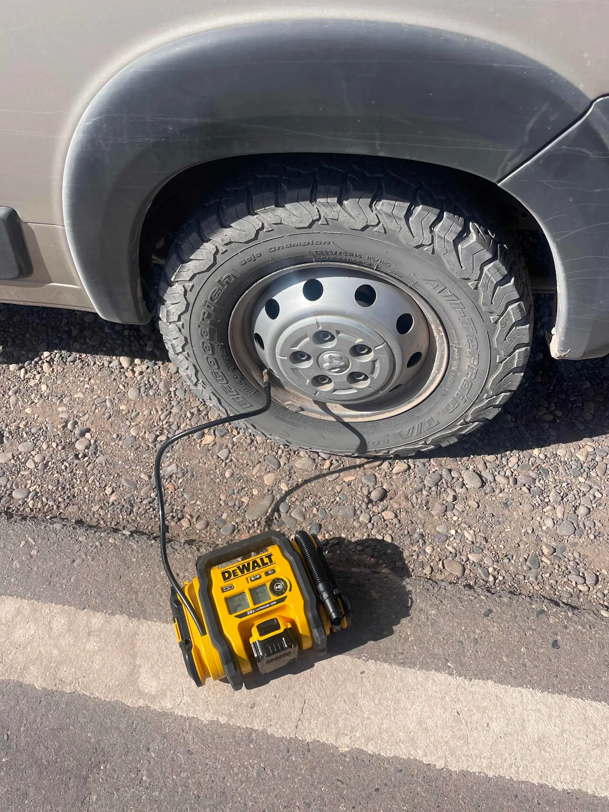 I inflated the tires which took an hour and a quarter while Layne prepared ramen for a late lunch as I moved the inflator from wheel to wheel to get us ready for speed on asphalt. Forty miles an hour felt fast after that lot of dirt and dust.