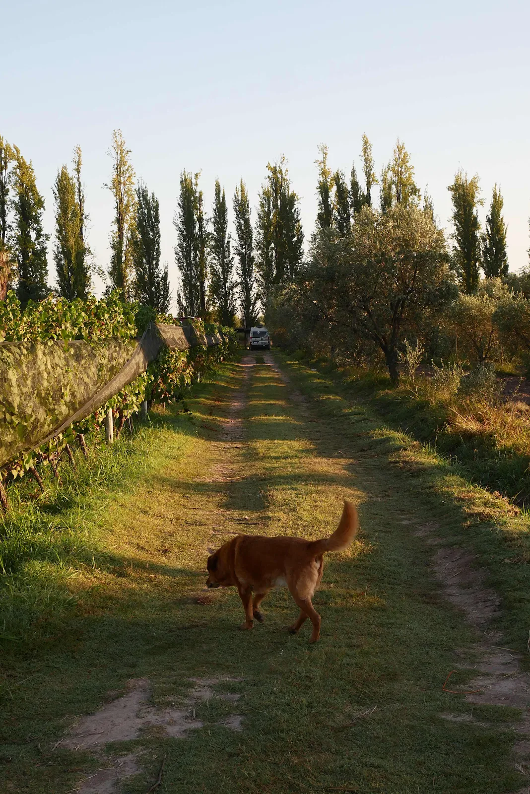 We arrived here in Maipu on the outskirts of the big city and found camping in a hotel, Posada de Cavieres, and its vineyard. We take hot showers in the main building have electricity to plug into but only at night when the outside lights come on, and pay $20 a night for a quiet spot in the countryside.