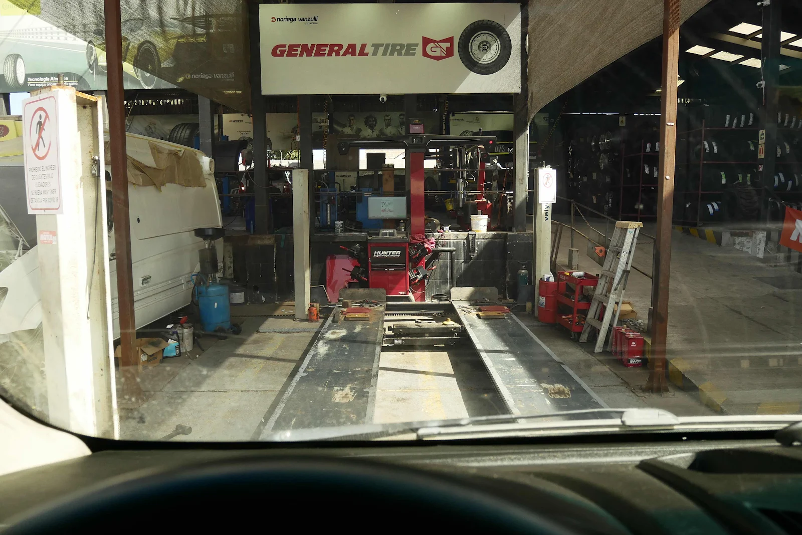 The tire shop on Balmaceda Avenue opens at nine am so we got up yesterday at 7:20. We left at a few minutes after nine from the campground and I only missed one turn so we got there at nine twenty. At 9:31 an employee showed up, opened the garage went to talk to the other customer waiting for service. Eventually another employee showed and by ten am we were inside the shop getting our new BF Goodrich KO2s installed. Slowly.