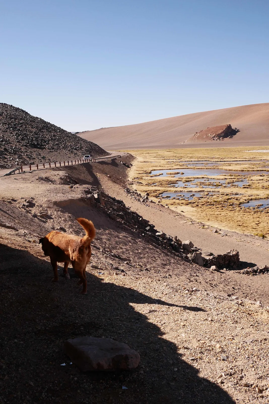 It’s marked as a lagoon on Google Maps and there is enough water to sustain life because we saw birds that looked like thrushes up here and herds of guanacos too.