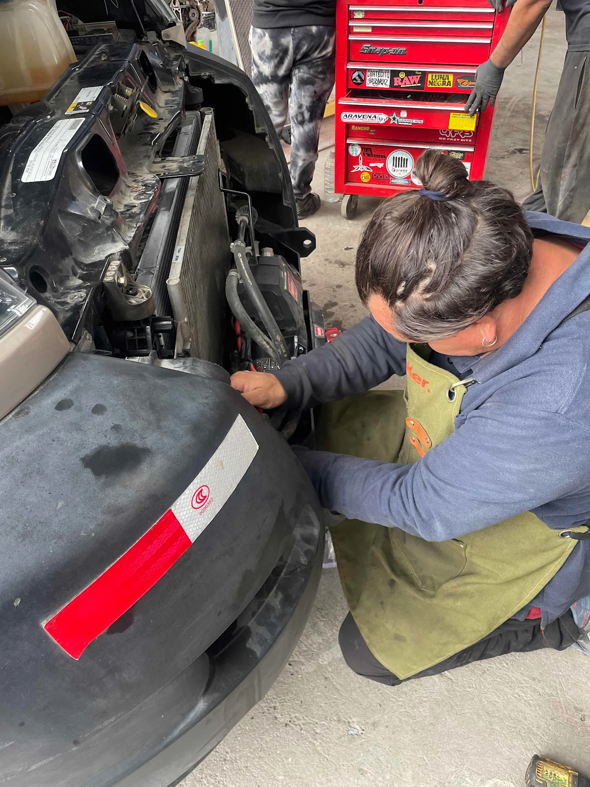 When we got stuck in Belize two years ago we were getting a tug out of the mud when the towline snapped the hitch on the truck and it flew back and wrecked our radiator. I think that installation left out two critical bolts ( highlighted below) because when we inspected the broken radiator this time there was some play. My thinking is the rough roads we’ve driven combined with the movement allowed by the absent bolts, caused the plastic to split. I’m hoping Jerry’s new bolts will prevent that happening again.