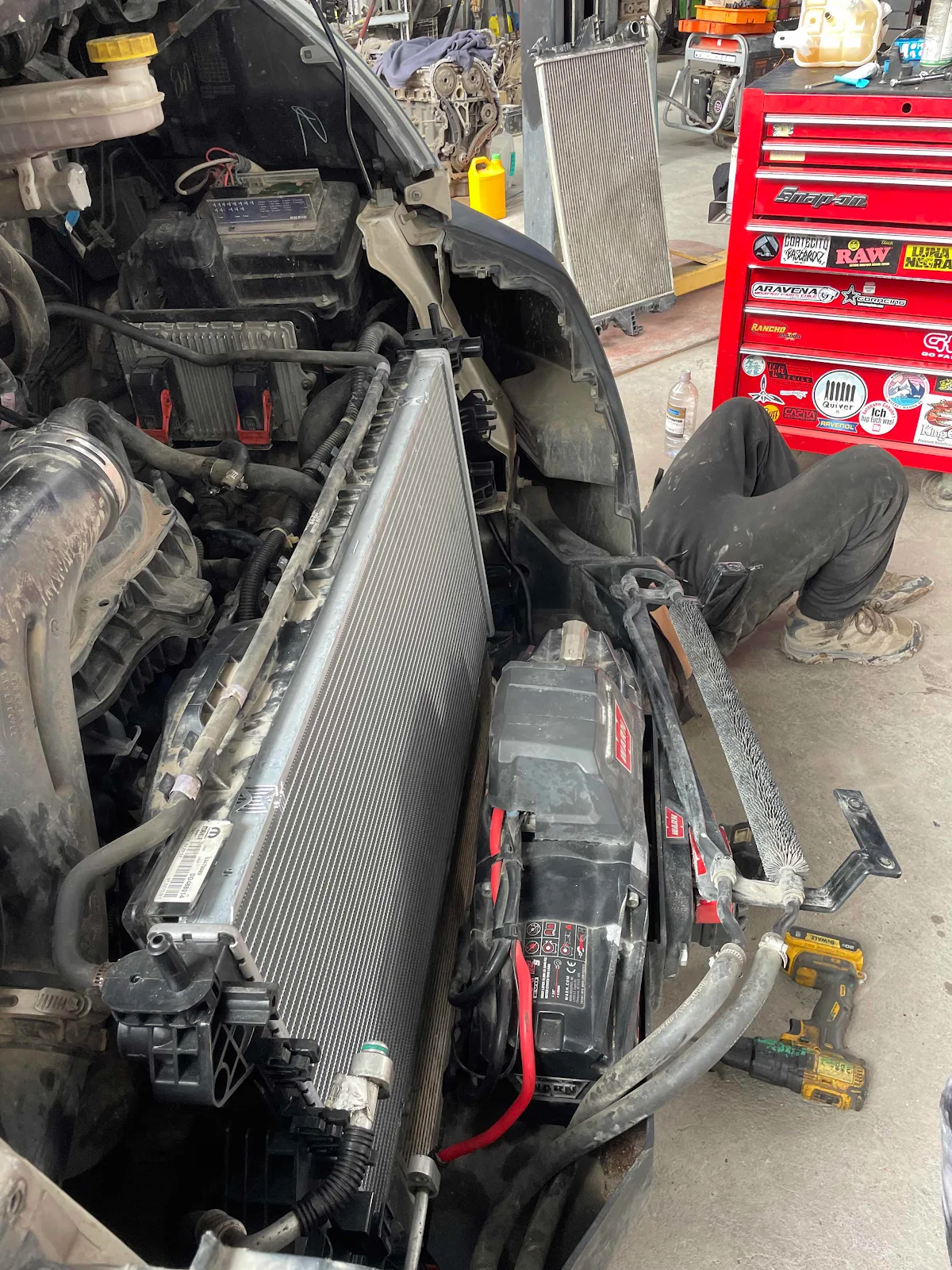 I was hopping around watching the new radiator fit into its slot. It took eight days to get here from the European warehouse and we had no issues with customs. The radiator came with four gallons of radiator fluid Jerry ordered from the Jeep dealer. The cost for parts was $450.