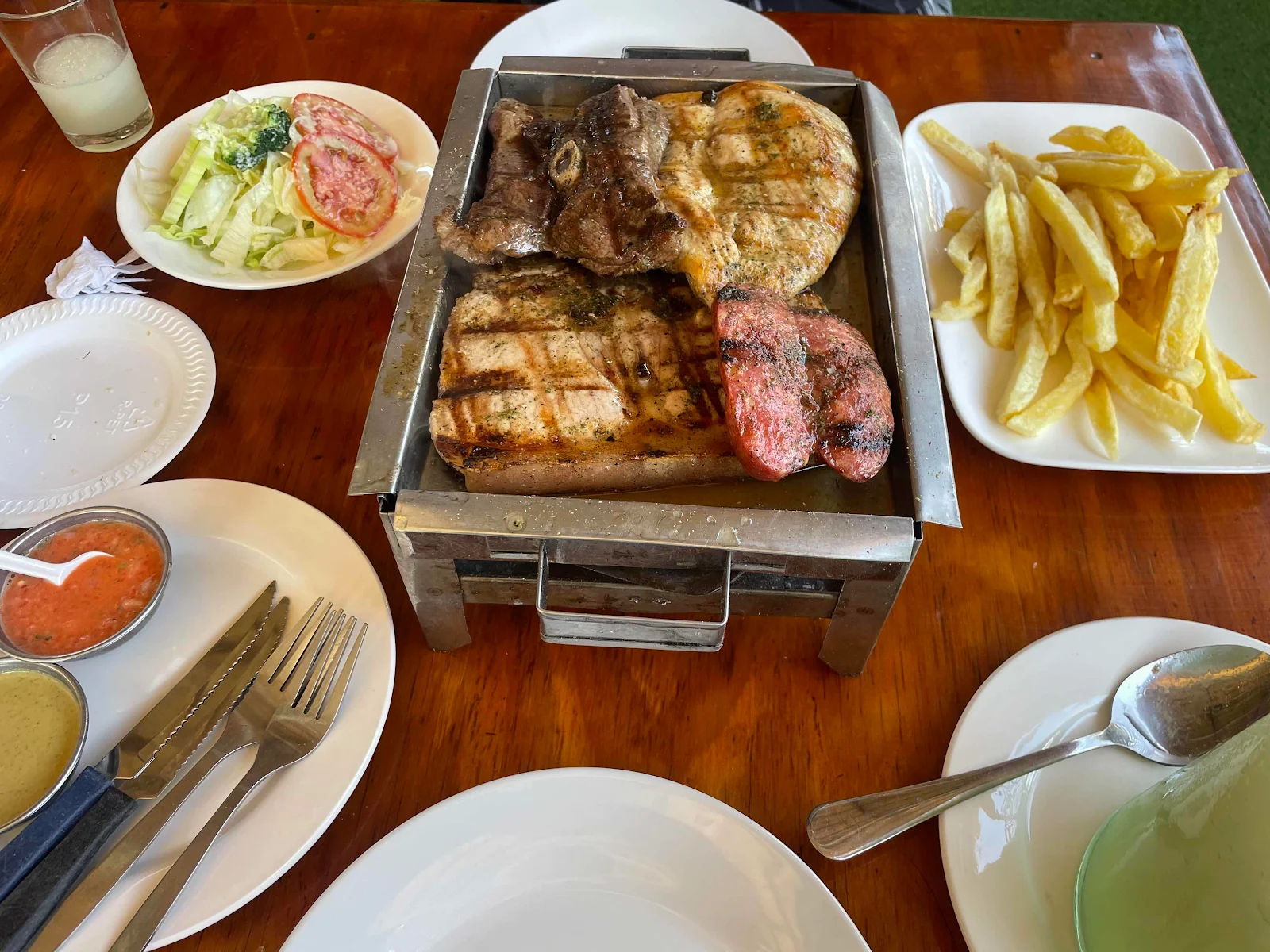 Recommended to us by Mark the mechanic in Iquique and also in iOverlander (an old entry which we updated) we ate at La Glorieta. Layne on this occasion wanted meat so we shared a $16 mixed grill with lamb, pork and chicken. It was half the price of Chile with lots of opportunities for leftovers.