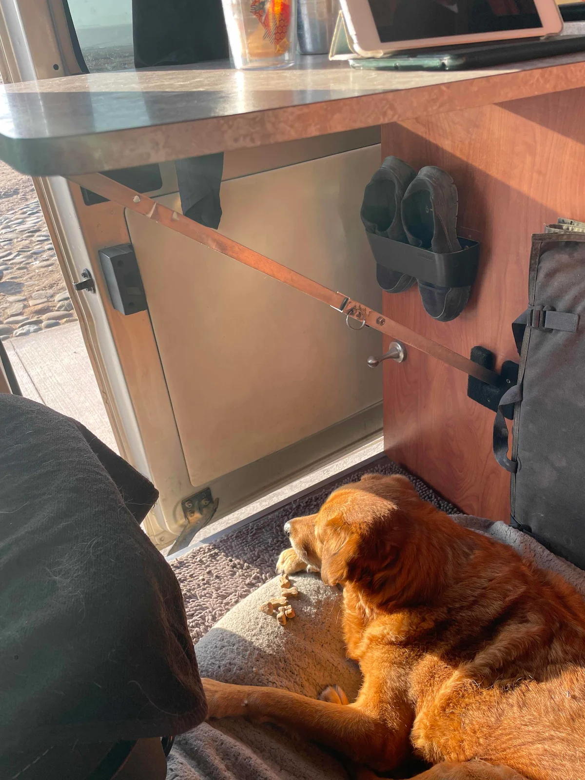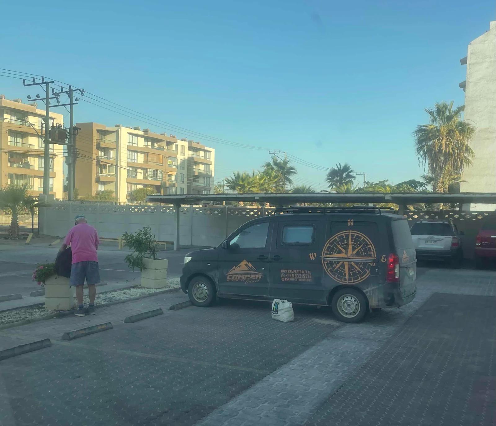 All evening long we’d heard mysterious musical pings coming from somewhere inside the van. Layne denied it was her phone but I’m a man so I knew better: obviously she’d just set it to ping with a new tone when she got a message and she’d forgotten. What else could it be? People are always leaving her WhatsApp notes so her phone is pinging constantly but not usually with that weird tone. Well, weren’t we surprised to find a big black Motorola cellphone sitting on our equally black dashboard in the morning. That had us puzzled: who the hell broke into the van during the night and how did they lock the doors after they forgot to steal anything and also left behind their phone? Then I remembered the guy who’d refused to give me his name but I had given a lift to the day before, when he was suffering the heat walking back to his rental van.