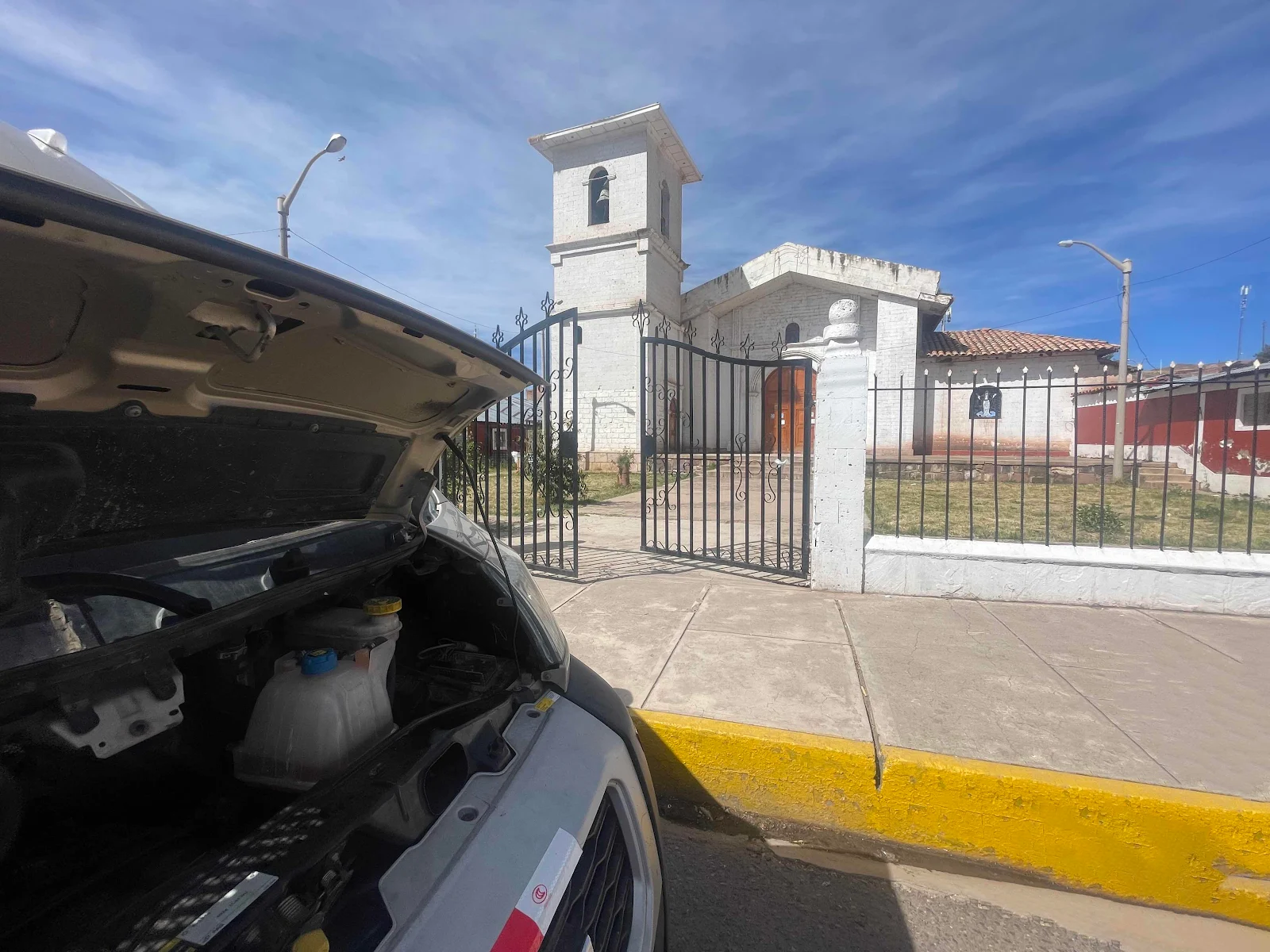 The engine started to overheat as we rolled into the main square of a tiny town called MaƱazo in the middle of nowhere. Below you can see a police car as we were in front of the church across from city hall and the police station. And GANNET2’s hood is open. We were stuck. Scary huh?