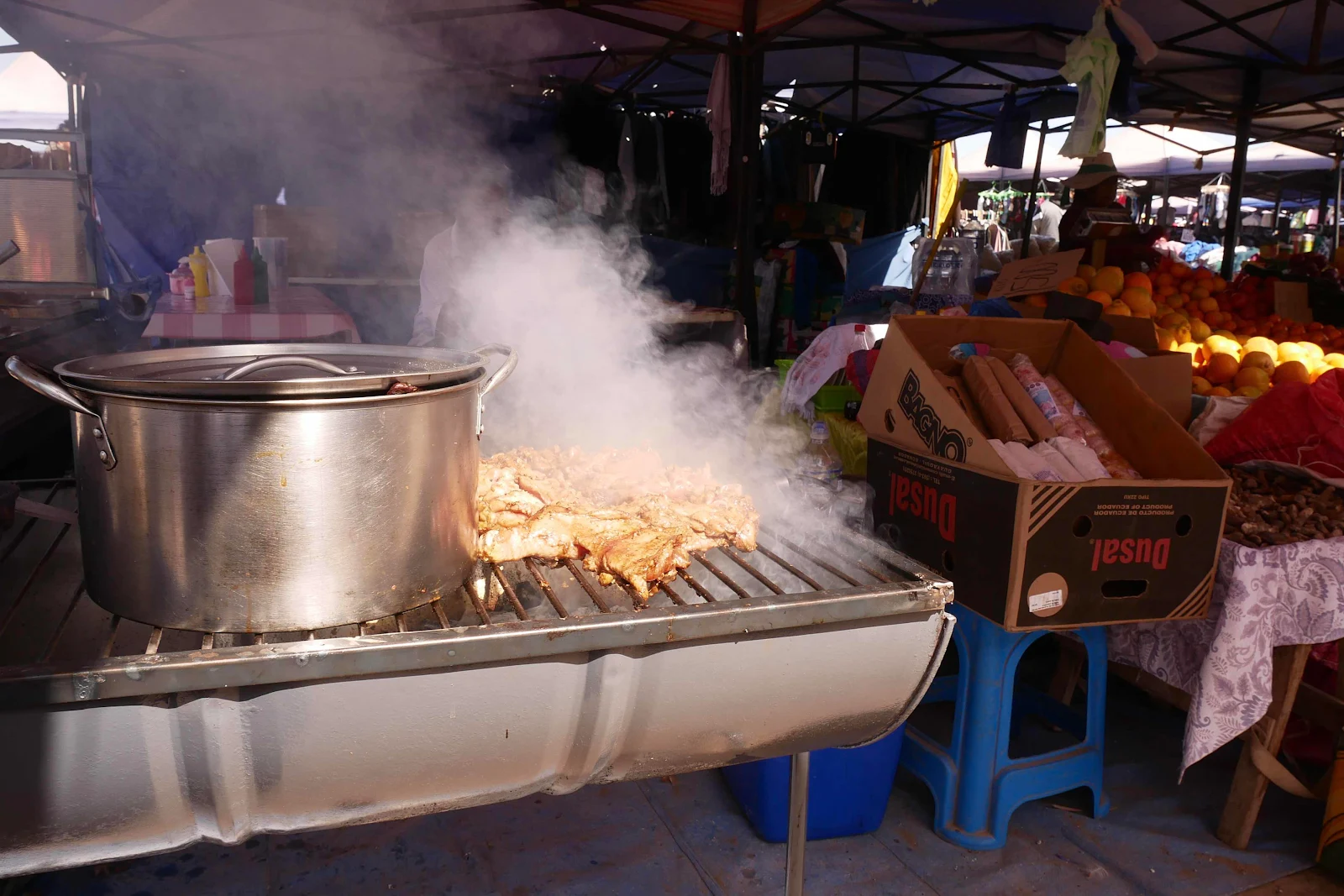 Chicken and pork rotating on spits, we walked by but this was going to be lunch on the way back.