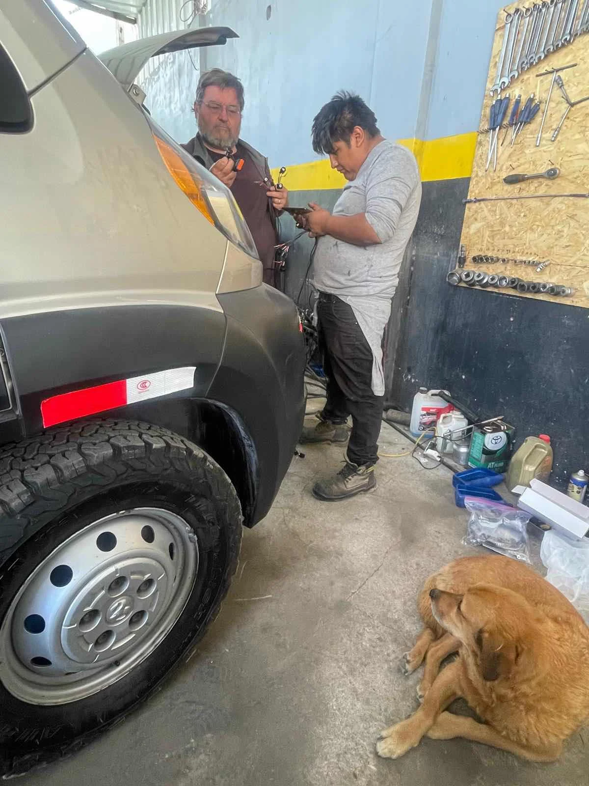 Freddy the electrician in the middle being watched by Chato on the left and Renzo on the right. Installing an ethanol sensor and extra fuel injector sensors.