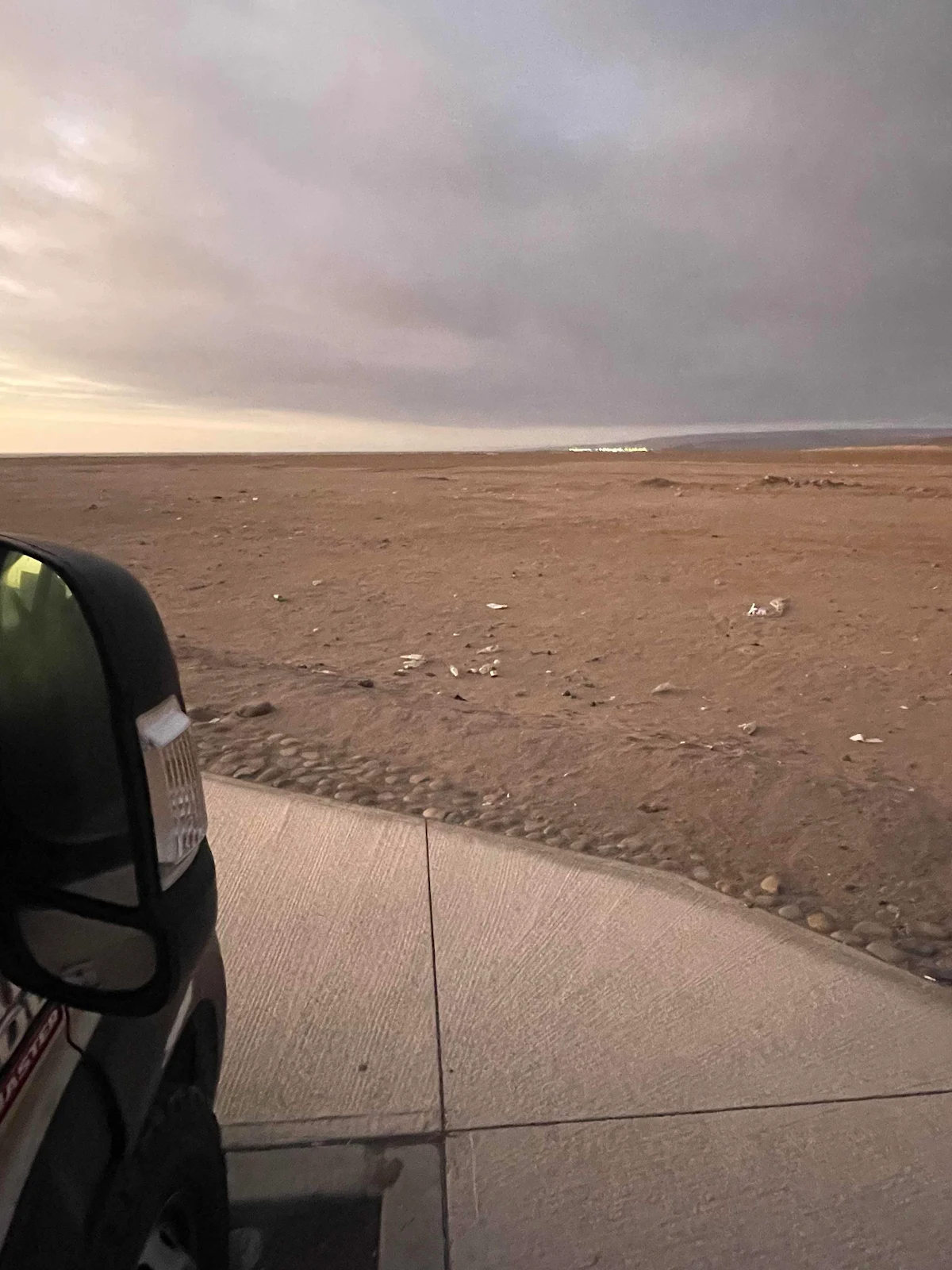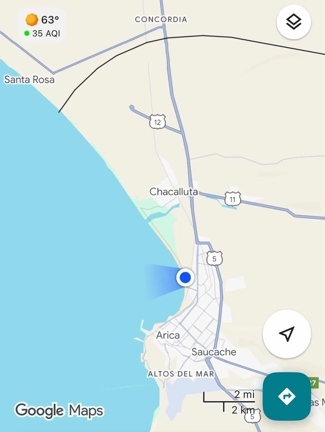 We cc put up with it for a bit but sheep was out of the question so we did what makes sense when your home is on wheels and the neighbors are out of control. The plan was to drive twenty minutes to the airport where we know of quiet parking but on our way we passed the end of the beach which appeared very quiet. We stopped. There was a large green Brazilian Sprinter van already parked and I pulled in nearby but not, I hope too close. The airport parking lot is on Highway 12 below. The black line is the border with PerĂº: