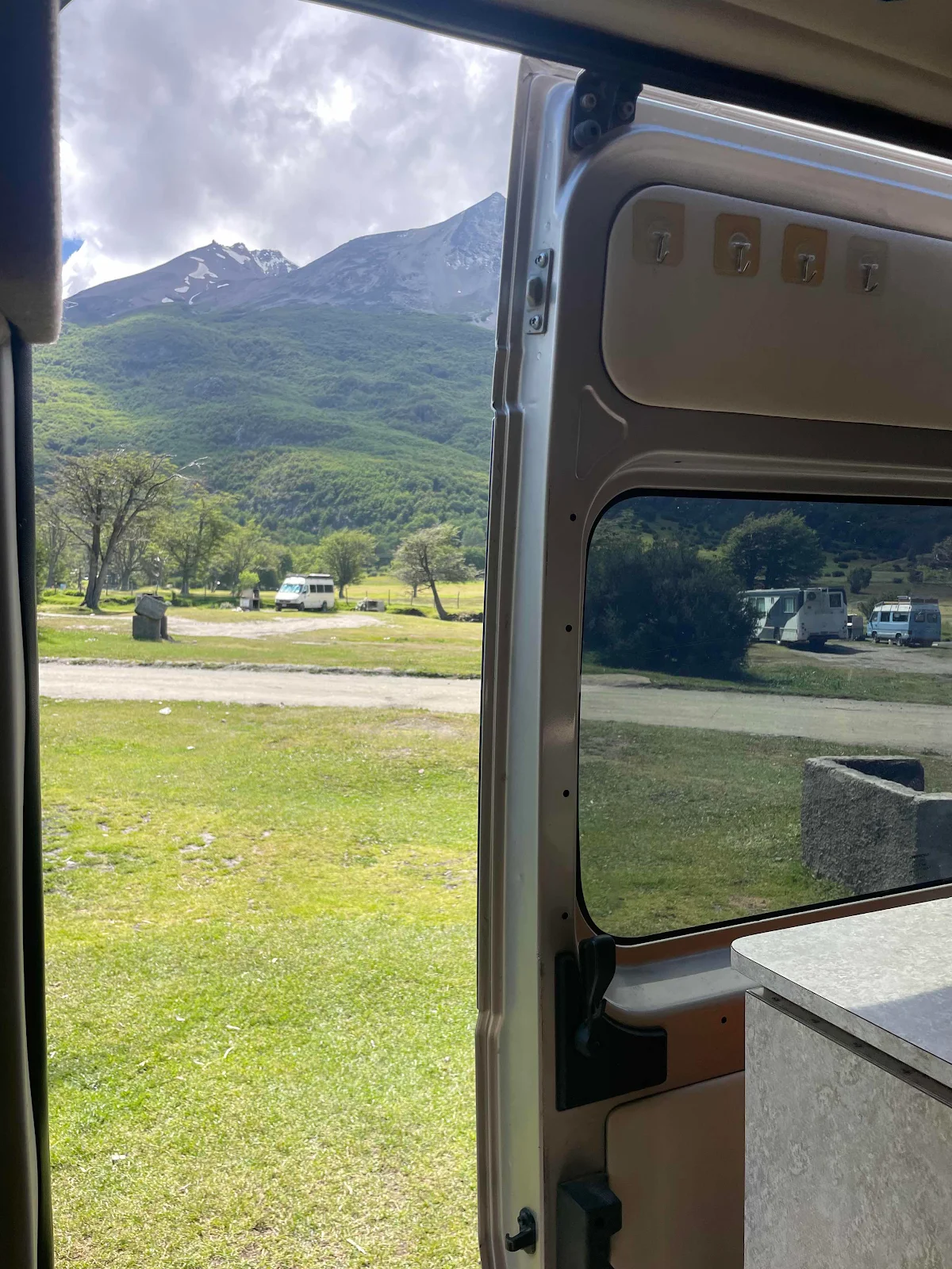 We awoke to rain and cold and mud in a campground yesterday but by lunchtime the sun was out and sunshine in Tierra Del Fuego means but one thing: it will be windy. As you can see above the wind did pick up.