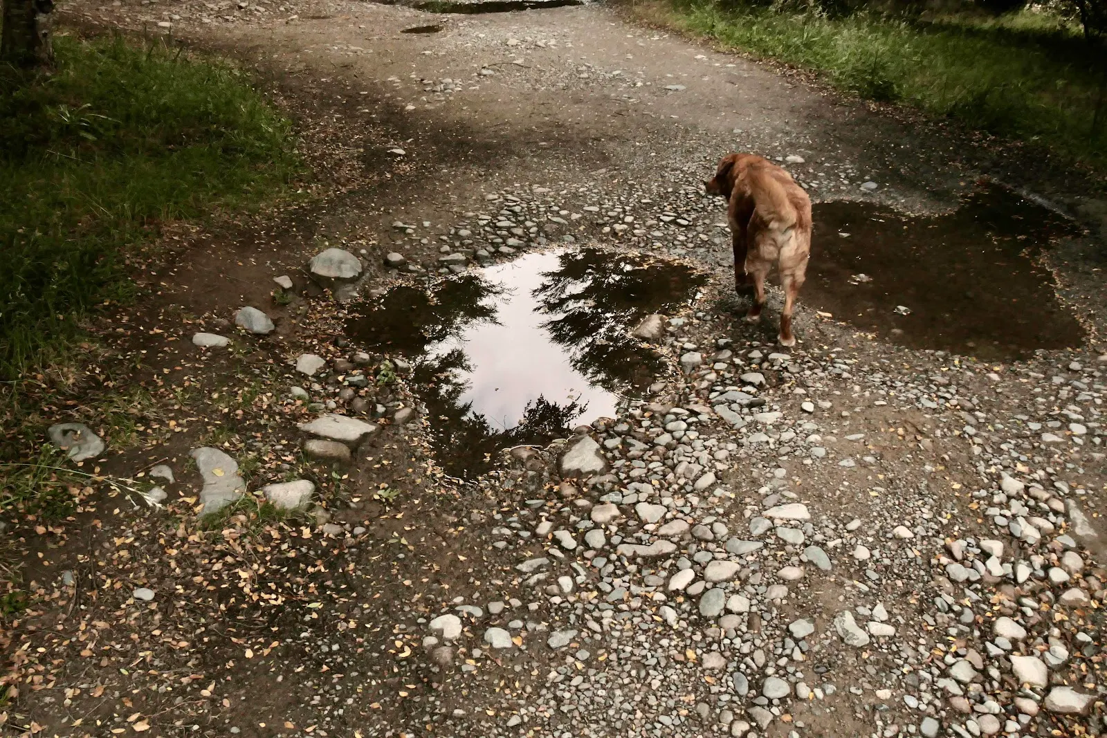 My old friend the garbage gravel was back with water filled potholes and all. We had 14 miles to go to our next proposed wild camp site. On pavement that would have been twenty minutes, now it looked to be more than an hour. Perfect.
