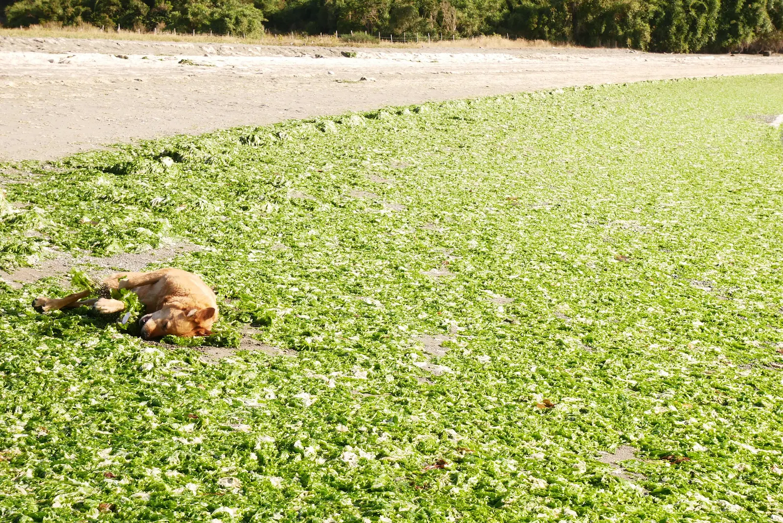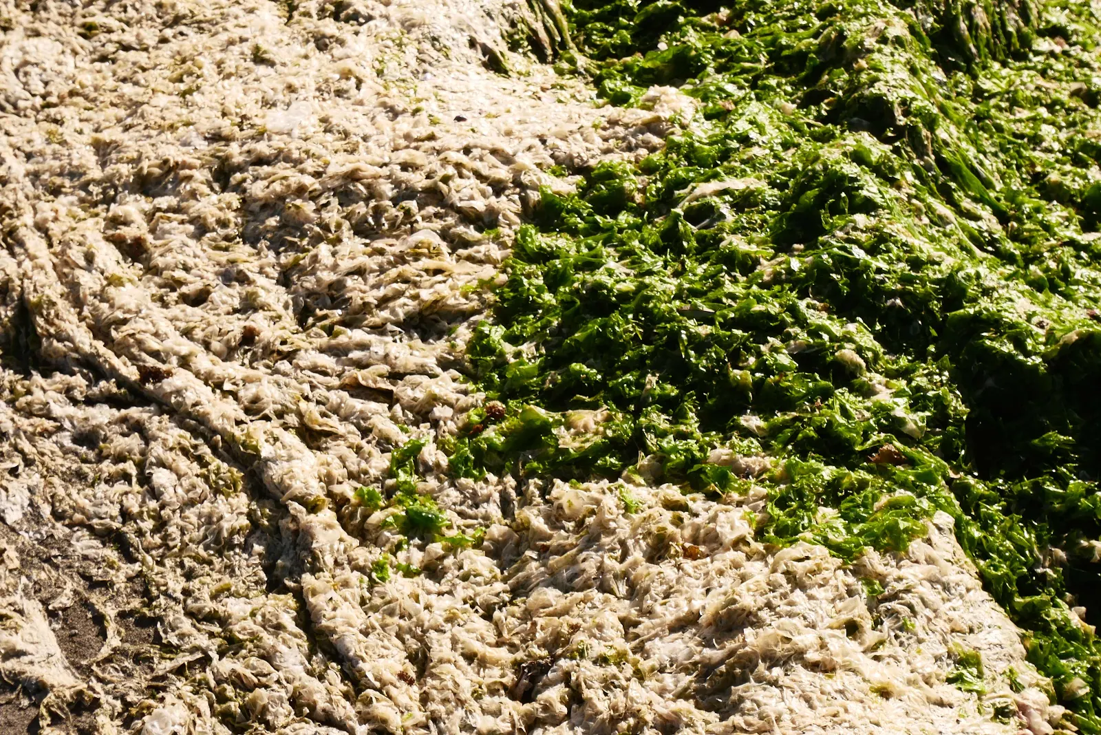 I stepped on it and nearly took a backward flop into it which would have been a mess. Where my foot slipped out from under me I found wet green seaweed underneath the dried white stuff on top. It looked to my jaundiced eye like a spinach pie with phyllo pastry on top.