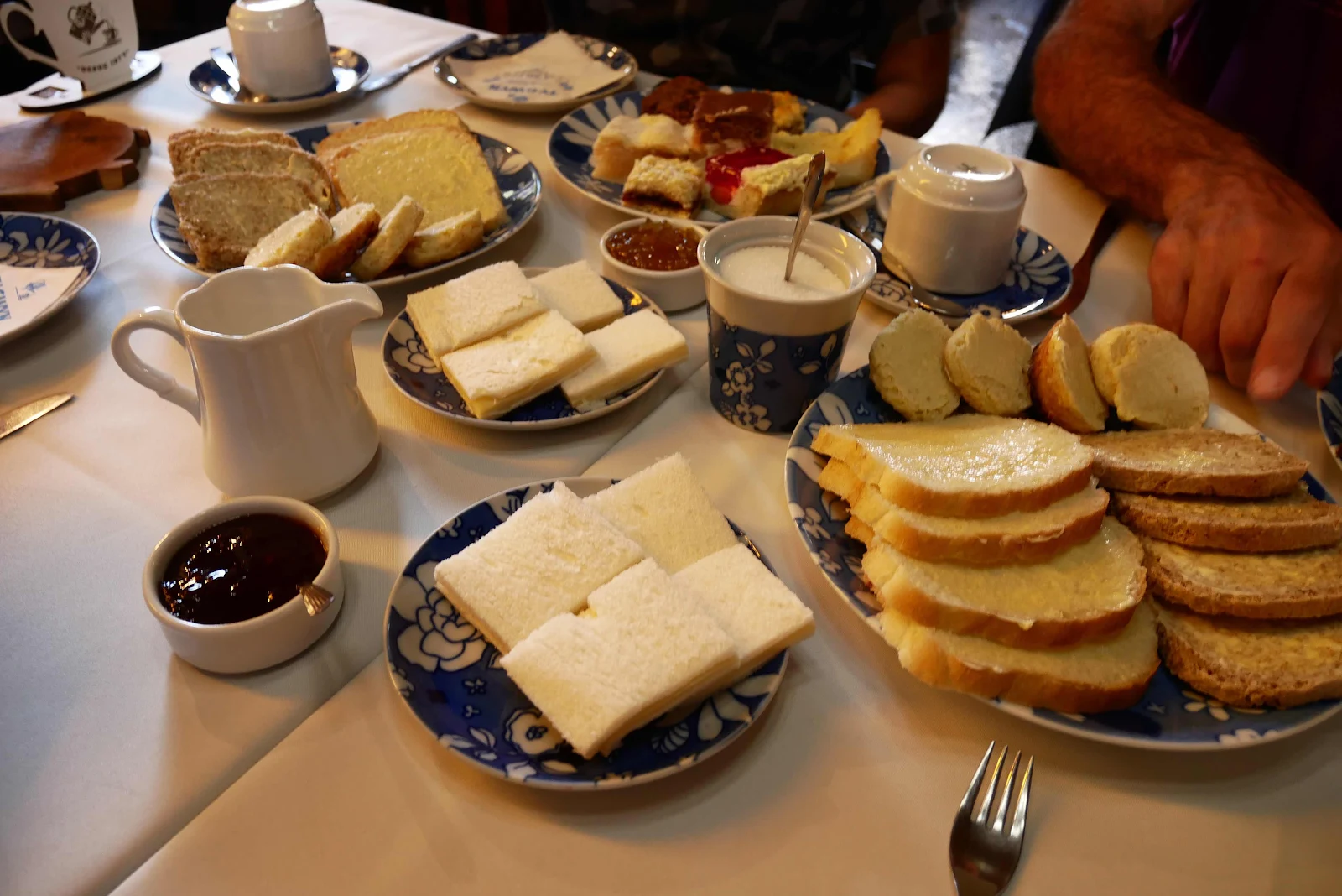 Bread and butter, scones, cheese sandwich square’s and cakes.