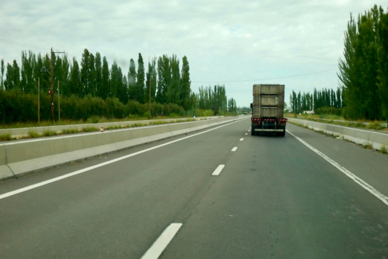 Meanwhile there was a country to cross so we left the campground around eleven, a slow start of course, and got on Highway 22. This is apple and pear country and the river valley is packed with orchards. Below you can see the back end of a truck hauling fruit in the boxes.