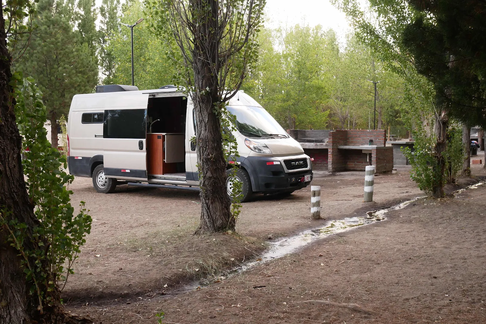 We parked in an empty spot after we got a few waves from the Argentines already installed drinking maté and starting a fire for the daily asado, grilled meat. They grill meat every evening in all campgrounds over wood fires. Every campground has solid brick open grills for meat grilling.