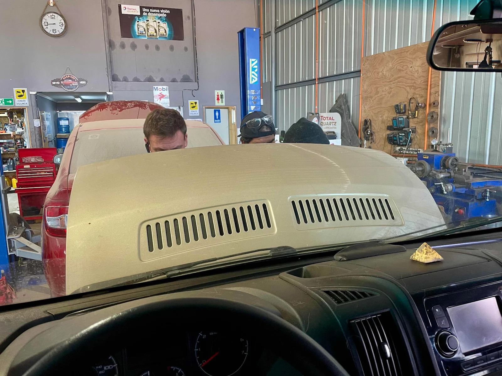 I explained what I needed to Giorgio and his two mechs it’s and they were fascinated by my Fiat Ducato van with a sideways V6 Jeep engine. Pull it in because we’ll check it out but I have lots of work today. Oh well we thought bracing ourselves to come back the next day.