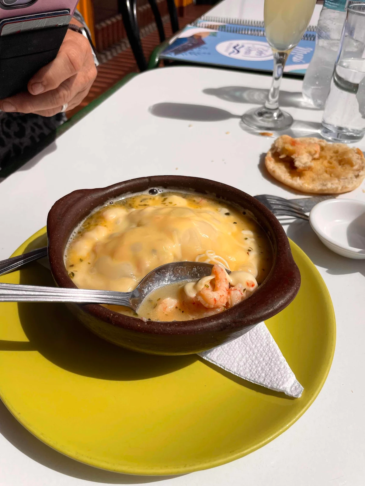 Our waitress was a moron. Or possibly she was just scared of foreigners. We received our first course, a bowl of shrimp and cheese to share.