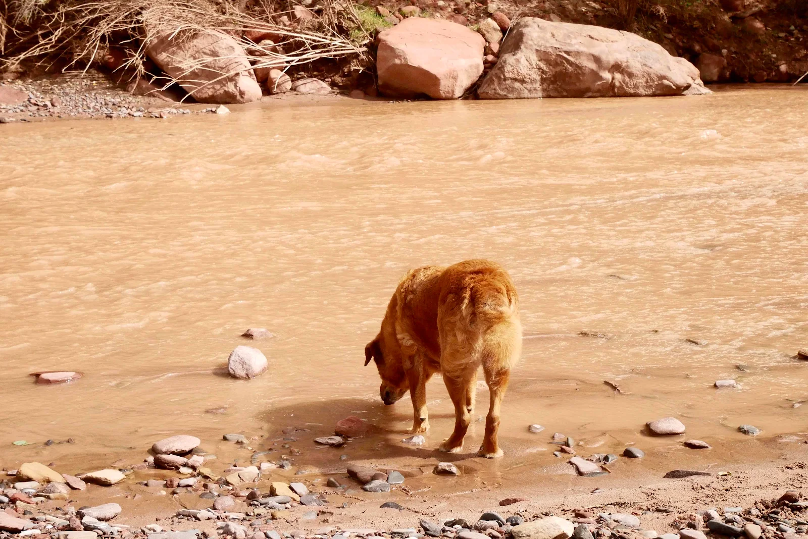 We entered the scenic part of Highway 68 and Layne was still asleep. I called her but she didn’t wake up so I stopped and took Rusty for a walk. She’d told me to wake her to see the Quebrada de las Conchas, the ravine of the shells.