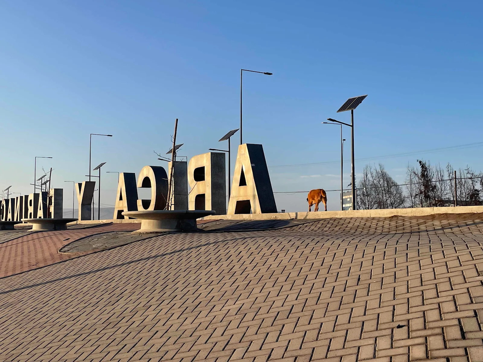 Rusty got his walk of course down the road leading to the airport past the welcome sign in stainless steel.