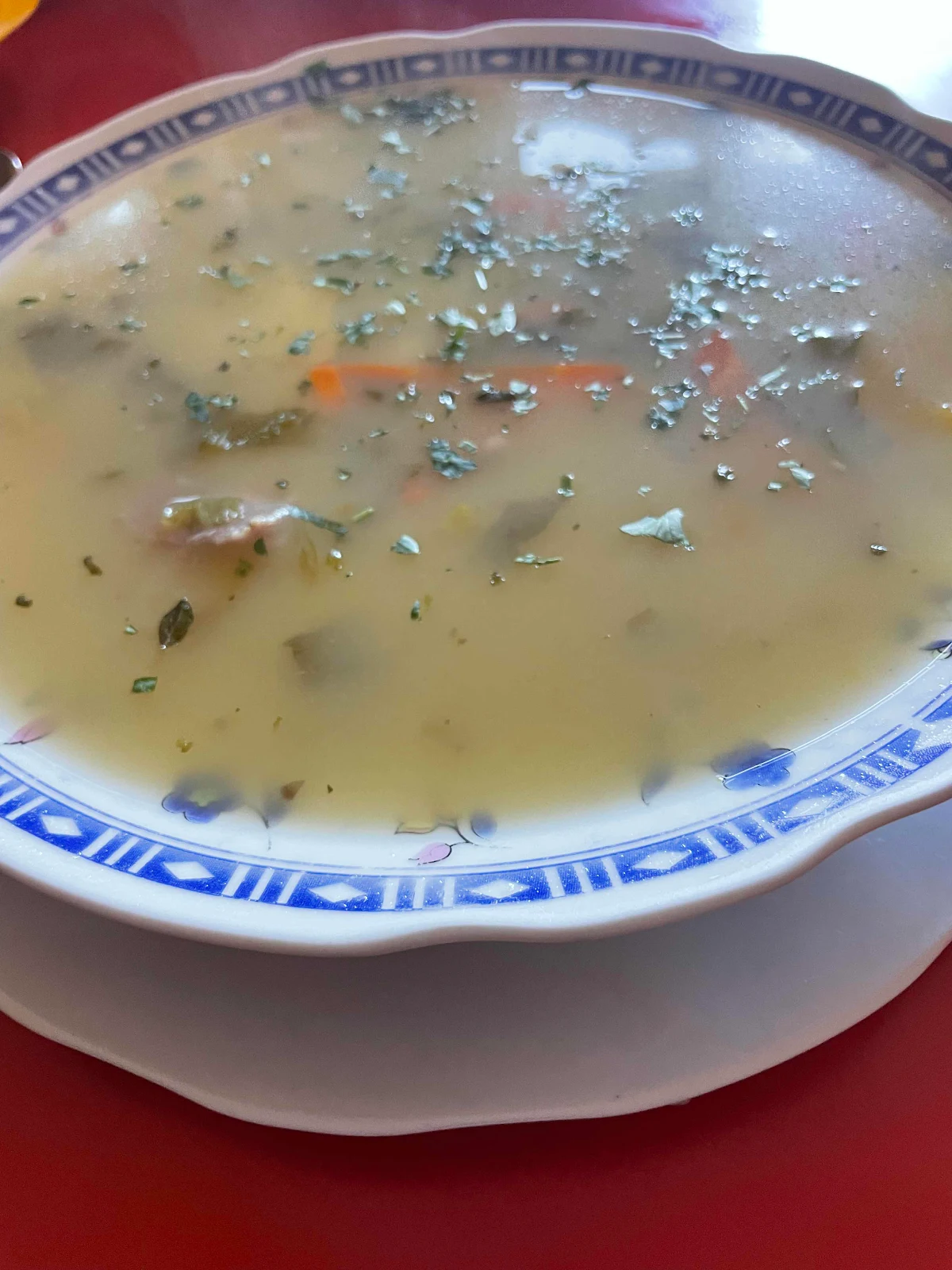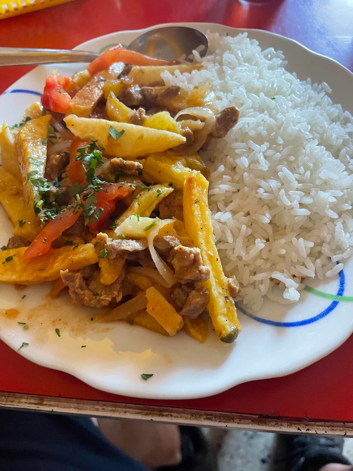 Alpaca, potatoes, tomatoes and onions and rice. Soup and the plate for $2:20.