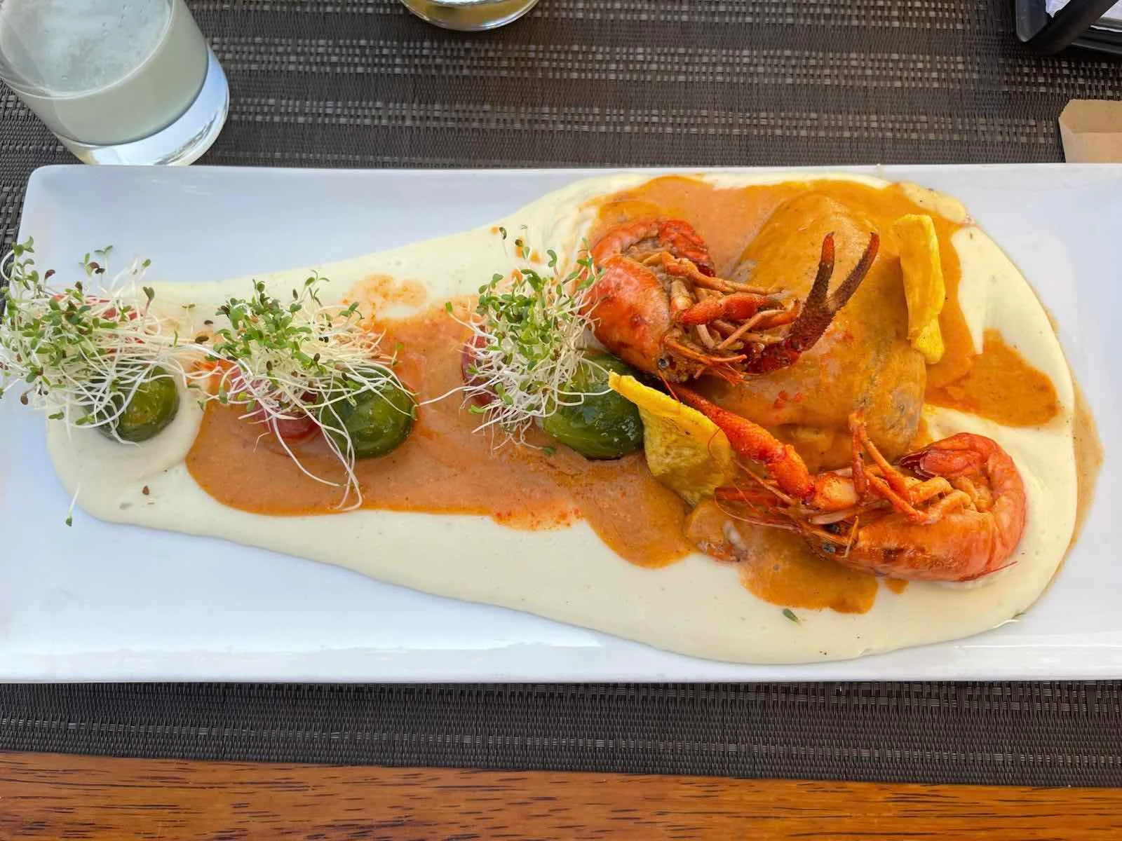Peru has a reputation for imaginative cuisine and here we have fish, crawfish, Brussels sprouts and puréed potatoes. Not a combination I’d had before but I would again.
