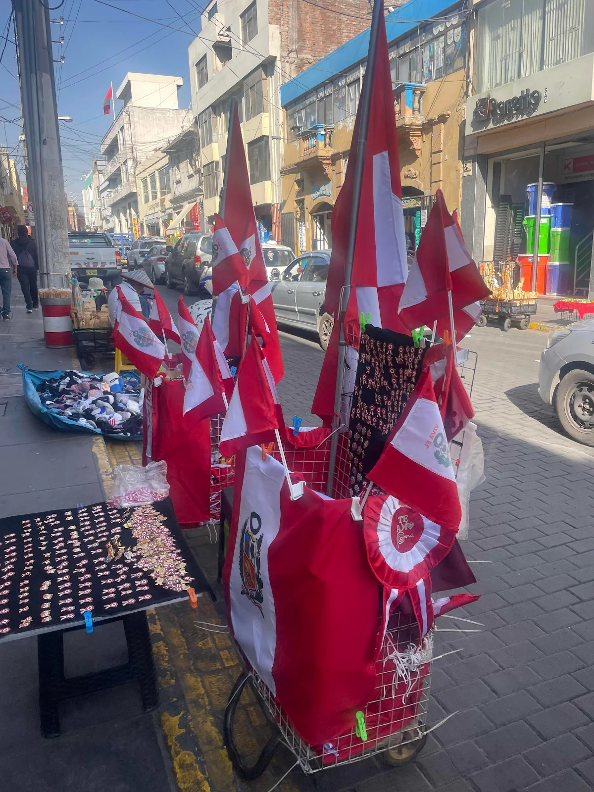 We have to leave Peru by August 14th at the very latest so we’ll miss the party but there are lots of flags for sale to start the celebrations amid the trash collectors’ strike.